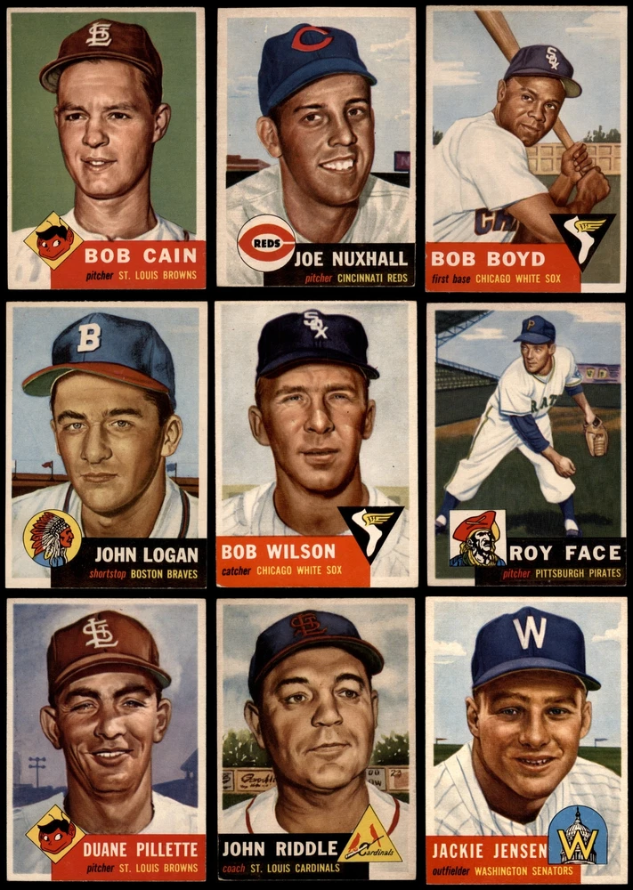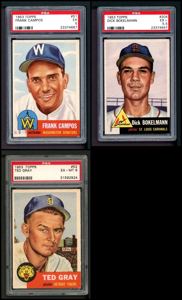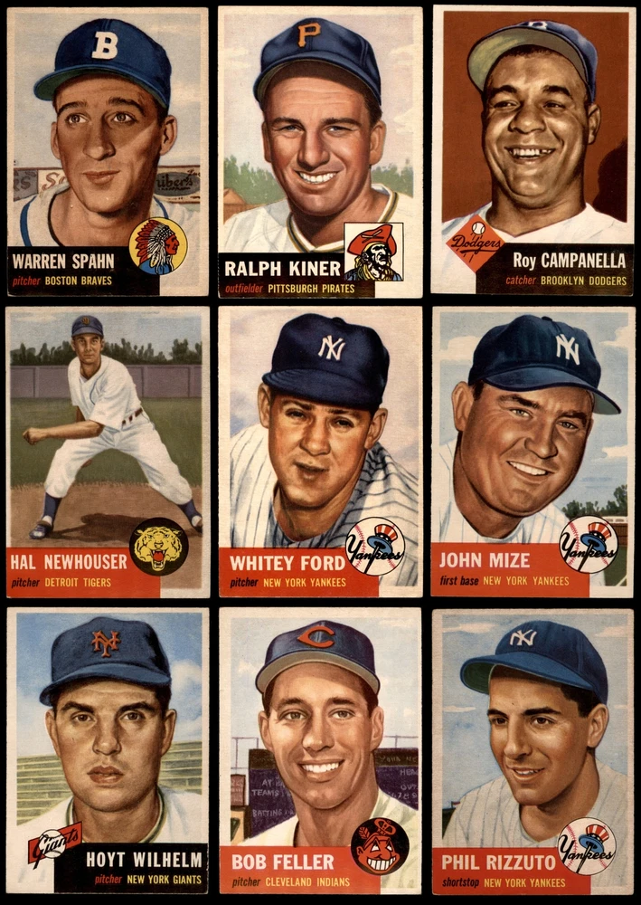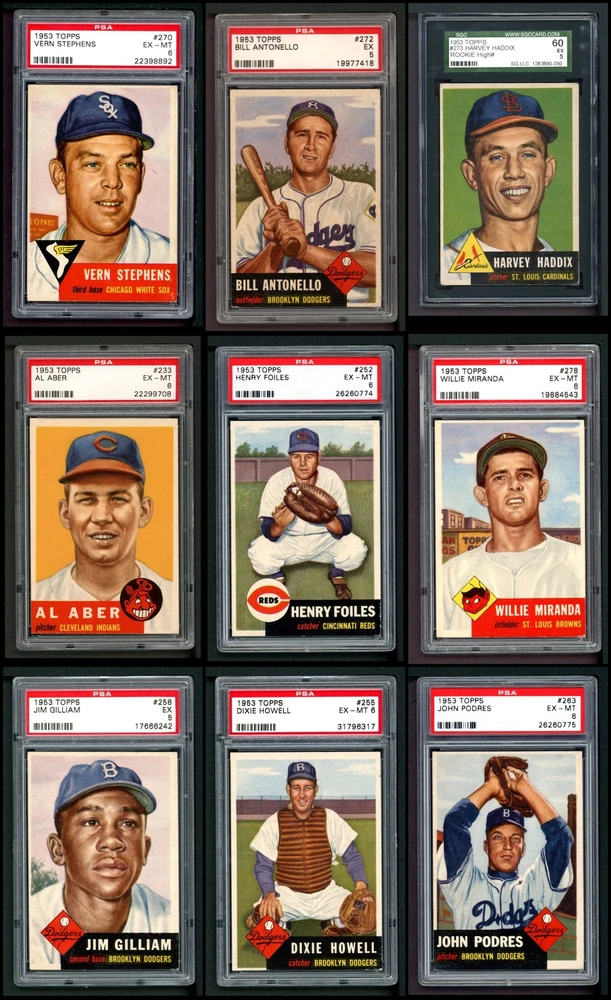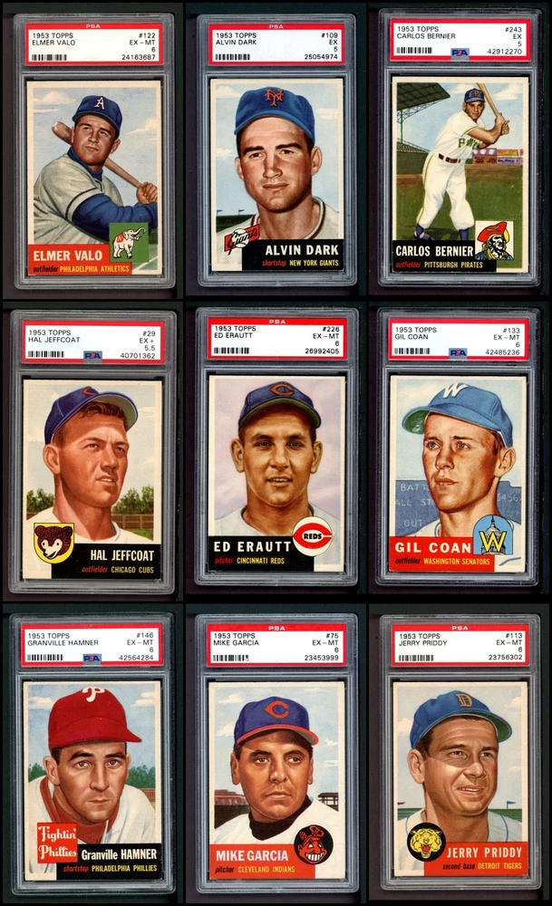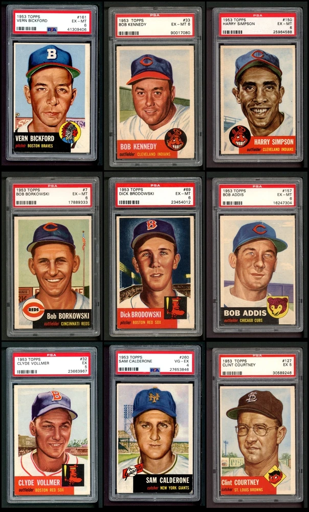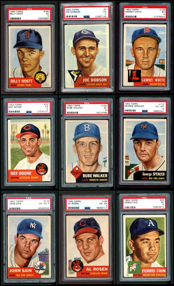 This set contains the following cards 1953 Topps #1 Jackie Robinson PSA 7 - NM Front Back 1953 Topps #2 Luke Easter 4 - VG/EX Front Back 1953 Topps #3 George Crowe 4 - VG/EX Front Back 1953 Topps #4 Ben Wade 6 - EX/MT Front Back 1953 Topps #5 Joe Dobson PSA 5 - EX Front Back 1953 Topps #6 Sam Jones 5 - EX Front Back 1953 Topps #7 Bob Borkowski PSA 6 - EX/MT Front Back 1953 Topps #8 Clem Koshorek 6 - EX/MT Front Back 1953 Topps #9 Joe Collins 5 - EX Front Back 1953 Topps #10 Smoky Burgess 4 - VG/EX Front Back 1953 Topps #11 Sal Yvars 6 - EX/MT Front Back 1953 Topps #12 Howie Judson 4 - VG/EX Front Back 1953 Topps #13 Connie Marrero 4 - VG/EX Front Back 1953 Topps #14 Clem Labine 3 - VG Front Back 1953 Topps #15 Bobo Newsom 6 - EX/MT Front Back 1953 Topps #16 Peanuts Lowrey 4 - VG/EX Front Back 1953 Topps #17 Billy Hitchcock 6 - EX/MT Front Back 1953 Topps #18 Ted Lepcio 4 - VG/EX Front Back 1953 Topps #19 Mel Parnell 3 - VG Front Back 1953 Topps #20 Hank Thompson 5 - EX Front Back 1953 Topps #21 Billy Johnson 4 - VG/EX Front Back 1953 Topps #22 Howard Fox 4 - VG/EX Front Back 1953 Topps #23 Toby Atwell 4 - VG/EX Front Back 1953 Topps #24 Ferris Fain PSA 5 - EX Front Back 1953 Topps #25 Ray Boone PSA 5 - EX Front Back 1953 Topps #26 Dale Mitchell 5 - EX Front Back 1953 Topps #27 Roy Campanella 7 - NM Front Back 1953 Topps #28 Eddie Pellagrini 5 - EX Front Back 1953 Topps #29 Hal Jeffcoat PSA 5.5 - EX+ Front Back 1953 Topps #30 Willard Nixon 4 - VG/EX Front Back 1953 Topps #31 Ewell Blackwell 6 - EX/MT Front Back 1953 Topps #32 Clyde Vollmer PSA 5 - EX Front Back 1953 Topps #33 Bob Kennedy PSA 6 - EX/MT Front Back 1953 Topps #34 George Shuba 5 - EX Front Back 1953 Topps #35 Irv Noren 6 - EX/MT Front Back 1953 Topps #36 Johnny Groth 4 - VG/EX Front Back 1953 Topps #37 Eddie Mathews PSA 6 - EX/MT Front Back 1953 Topps #38 Jim Hearn 4 - VG/EX Front Back 1953 Topps #39 Eddie Miksis 6 - EX/MT Front Back 1953 Topps #40 John Lipon 4 - VG/EX Front Back 1953 Topps #41 Enos Slaughter 5 - EX Front Back 1953 Topps #42 Gus Zernial 4 - VG/EX Front Back 1953 Topps #43 Gil McDougald 4 - VG/EX Front Back 1953 Topps #44 Ellis Kinder 4 - VG/EX Front Back 1953 Topps #45 Grady Hatton 6 - EX/MT Front Back 1953 Topps #46 Johnny Klippstein 5 - EX Front Back 1953 Topps #47 Bubba Church 5 - EX Front Back 1953 Topps #48 Bobby Del Greco 5 - EX Front Back 1953 Topps #49 Faye Throneberry 6 - EX/MT Front Back 1953 Topps #50 Chuck Dressen 6 - EX/MT Front Back 1953 Topps #51 Frank Campos PSA 5 - EX Front Back 1953 Topps #52 Ted Gray PSA 6 - EX/MT Front Back 1953 Topps #53 Sherm Lollar 4 - VG/EX Front Back 1953 Topps #54 Bob Feller 5 - EX Front Back 1953 Topps #55 Mickey McDermott 5 - EX Front Back 1953 Topps #56 Gerry Staley 4 - VG/EX Front Back 1953 Topps #57 Carl Scheib 5 - EX Front Back 1953 Topps #58 George Metkovich 4 - VG/EX Front Back 1953 Topps #59 Karl Drews 5 - EX Front Back 1953 Topps #60 Cloyd Boyer 5 - EX Front Back 1953 Topps #61 Early Wynn 3 - VG Front Back 1953 Topps #62 Monte Irvin 3 - VG Front Back 1953 Topps #63 Gus Niarhos 4 - VG/EX Front Back 1953 Topps #64 Dave Philley 6 - EX/MT Front Back 1953 Topps #65 Earl Harrist 5 - EX Front Back 1953 Topps #66 Minnie Minoso 4 - VG/EX Front Back 1953 Topps #67 Roy Sievers 6 - EX/MT Front Back 1953 Topps #68 Del Rice 4 - VG/EX Front Back 1953 Topps #69 Dick Brodowski PSA 6 - EX/MT Front Back 1953 Topps #70 Ed Yuhas 4 - VG/EX Front Back 1953 Topps #71 Tony Bartirome 5 - EX Front Back 1953 Topps #72 Fred Hutchinson 5 - EX Front Back 1953 Topps #73 Eddie Robinson 5 - EX Front Back 1953 Topps #74 Joe Rossi 5 - EX Front Back 1953 Topps #75 Mike Garcia PSA 6 - EX/MT Front Back 1953 Topps #76 Pee Wee Reese PSA 4 - VG/EX Front Back 1953 Topps #77 Johnny Mize 6 - EX/MT Front Back 1953 Topps #78 Al Red Schoendienst 4 - VG/EX Front Back 1953 Topps #79 John Wyrostek 4 - VG/EX Front Back 1953 Topps #80 Jim Hegan 5 - EX Front Back 1953 Topps #81 Joe Black 5 - EX Front Back 1953 Topps #82 Mickey Mantle PSA 5 - EX Front Back 1953 Topps #83 Howie Pollet 5 - EX Front Back 1953 Topps #84 Bob Hooper 5 - EX Front Back 1953 Topps #85 Bob Morgan 5 - EX Front Back 1953 Topps #86 Billy Martin PSA 4 - VG/EX Front Back 1953 Topps #87 Eddie Lopat 4 - VG/EX Front Back 1953 Topps #88 Willie Jones 5 - EX Front Back 1953 Topps #89 Chuck Stobbs 6 - EX/MT Front Back 1953 Topps #90 Hank Edwards 5 - EX Front Back 1953 Topps #91 Ebba St. Claire 5 - EX Front Back 1953 Topps #92 Paul Minner 5 - EX Front Back 1953 Topps #93 Hal Rice 3 - VG Front Back 1953 Topps #94 Bill Kennedy 5 - EX Front Back 1953 Topps #95 Willard Marshall 6 - EX/MT Front Back 1953 Topps #96 Virgil Trucks 5 - EX Front Back 1953 Topps #97 Don Kolloway 6 - EX/MT Front Back 1953 Topps #98 Cal Abrams 6 - EX/MT Front Back 1953 Topps #99 Dave Madison 5 - EX Front Back 1953 Topps #100 Bill Miller 5 - EX Front Back 1953 Topps #101 Ted Wilks 4 - VG/EX Front Back 1953 Topps #102 Connie Ryan 5 - EX Front Back 1953 Topps #103 Joe Astroth 5 - EX Front Back 1953 Topps #104 Yogi Berra PSA 5.5 - EX+ Front Back 1953 Topps #105 Joe Nuxhall 6 - EX/MT Front Back 1953 Topps #106 Johnny Antonelli 6 - EX/MT Front Back 1953 Topps #107 Danny O'Connell 4 - VG/EX Front Back 1953 Topps #108 Bob Porterfield 4 - VG/EX Front Back 1953 Topps #109 Al Dark PSA 5 - EX Front Back 1953 Topps #110 Herm Wehmeier 5 - EX Front Back 1953 Topps #111 Hank Sauer 4 - VG/EX Front Back 1953 Topps #112 Ned Garver 5 - EX Front Back 1953 Topps #113 Jerry Priddy PSA 6 - EX/MT Front Back 1953 Topps #114 Phil Rizzuto 4 - VG/EX Front Back 1953 Topps #115 George Spencer PSA 6 - EX/MT Front Back 1953 Topps #116 Frank Smith 4 - VG/EX Front Back 1953 Topps #117 Sid Gordon 5 - EX Front Back 1953 Topps #118 Gus Bell 5 - EX Front Back 1953 Topps #119 Johnny Sain PSA 4 - VG/EX Front Back 1953 Topps #120 Davey Williams 4 - VG/EX Front Back 1953 Topps #121 Walt Dropo 4 - VG/EX Front Back 1953 Topps #122 Elmer Valo PSA 6 - EX/MT Front Back 1953 Topps #123 Tommy Byrne 5 - EX Front Back 1953 Topps #