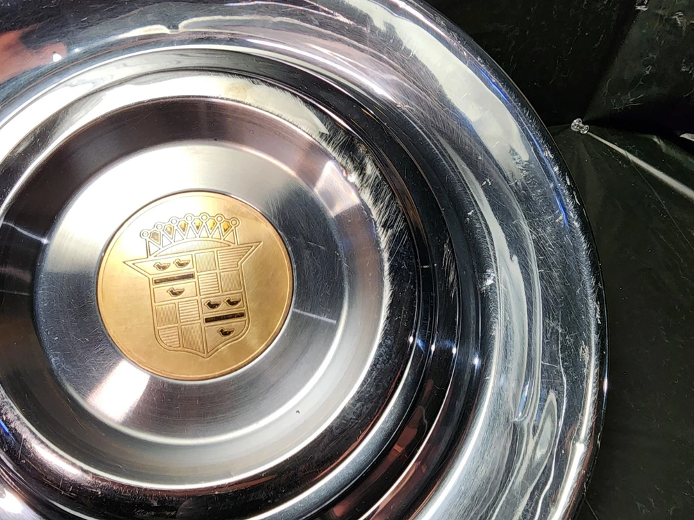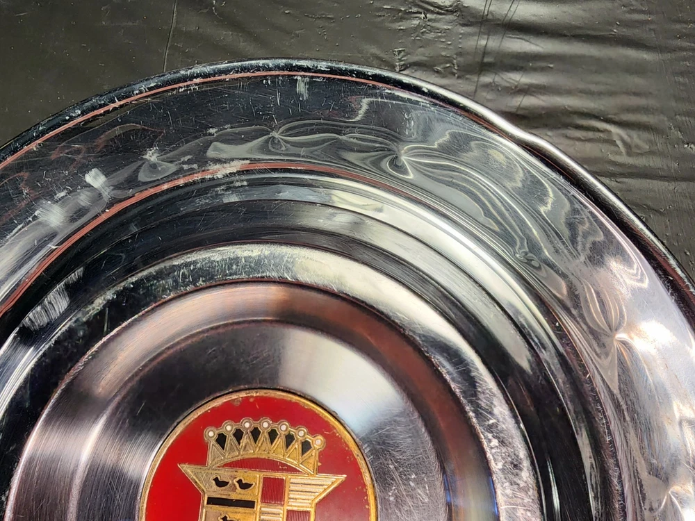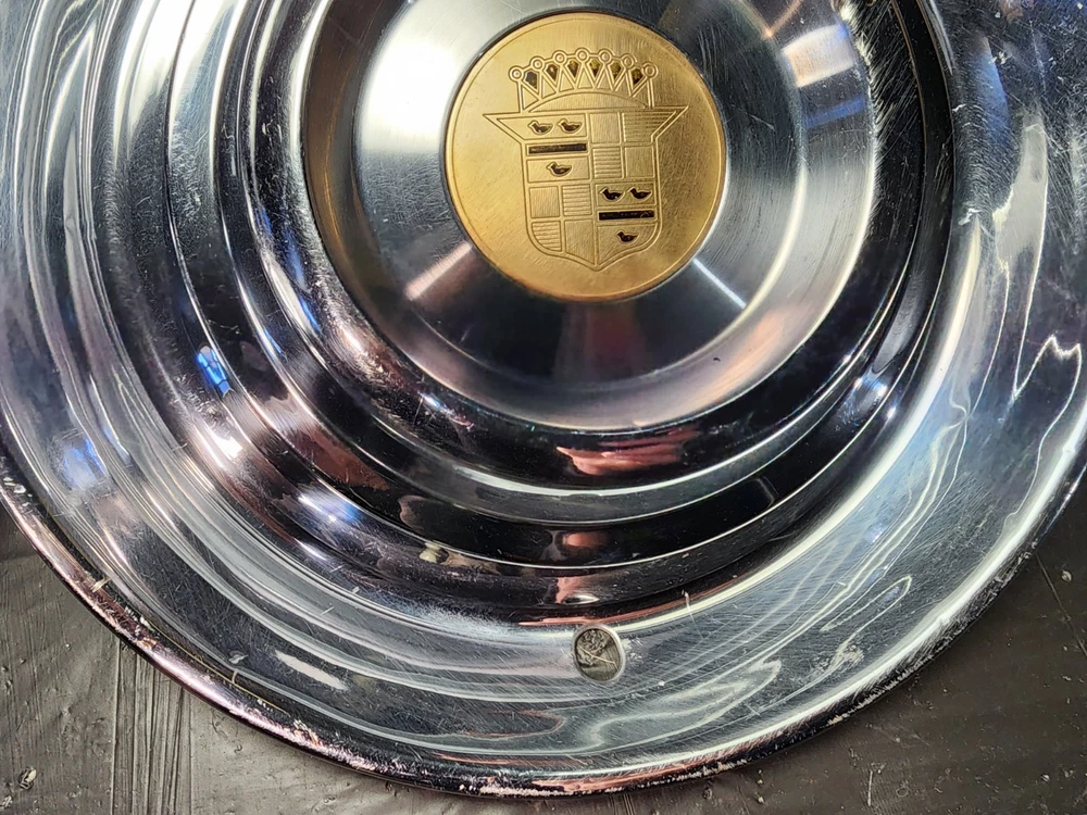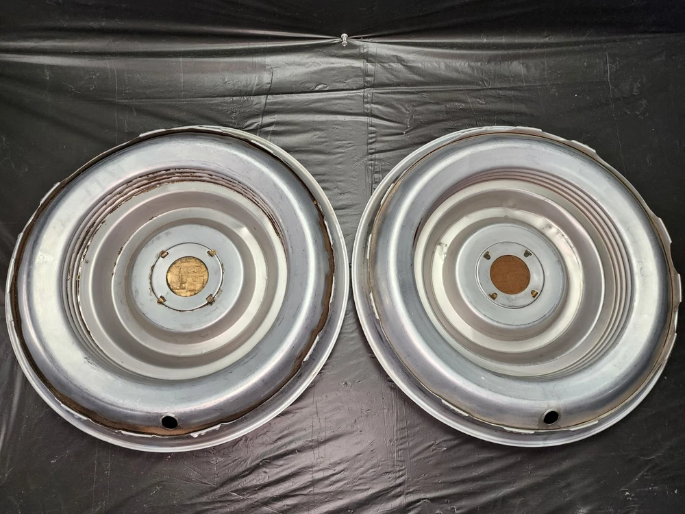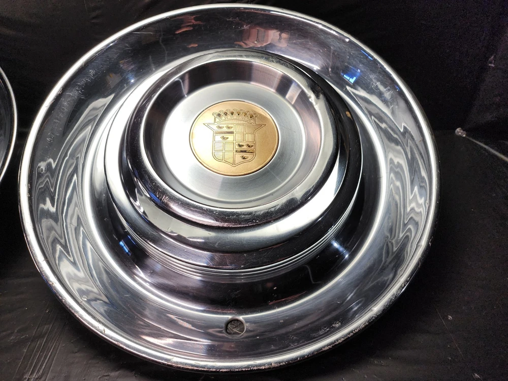 Vintage 40s 50s 60s 70s hub caps. 1954 1955 Cadillac pair of 2 Original OEM Factory OE hubcaps wheel covers center caps. in good condition considering their age and being used. These are Used hubcaps off of old classic cars that were driven on the road and used, so please see photos for complete condition as they are not all perfect. Most have some fading, dings, scuffing, mineral staining, etc could use a good polishing to bring em back to full shine, but otherwise in beautiful condition. Check out more of my ebay page as we are going through and listing a ton of classic / vintage hubcaps from the the 20's 30's 40's 50's 60's 70's 80's 90's 00's and up. all different makes and models such as Ford Chevy Chevrolet GM Cadillac GMC camero nova Chevelle Nomad Bel Air Mercury Corvette Mustang Oldsmobile Pontiac Lincoln Dodge Plymouth Buick Chrysler Mopar Fairlane Volkswagen Cheiftain Challanger Charger 1500 4x4 muscle car hot rod rat rod Cars and Trucks 15in 14in 16in and so much more from full sets to sets of 2 and singles, you name it check us out!