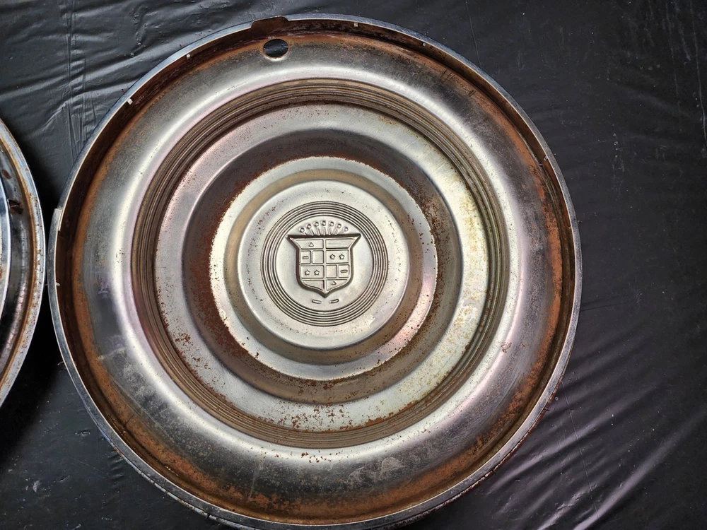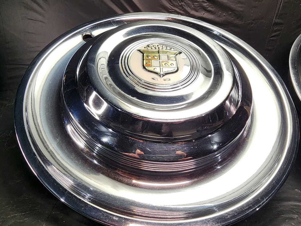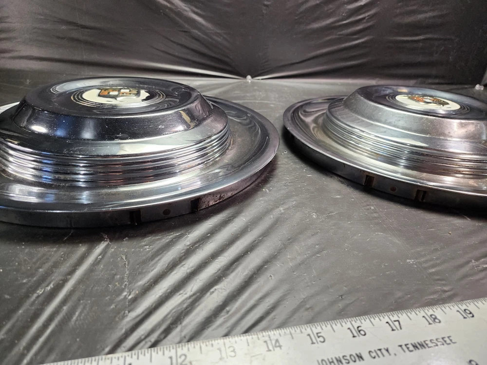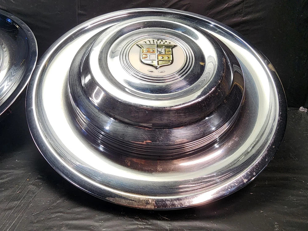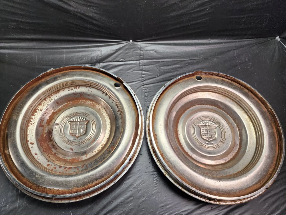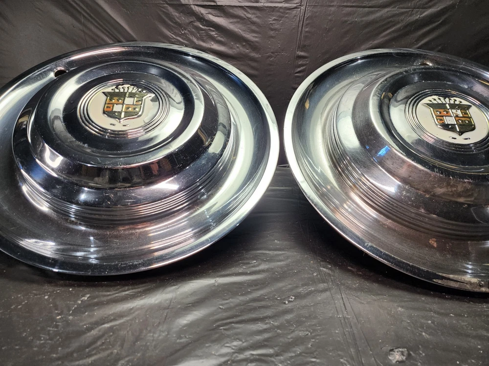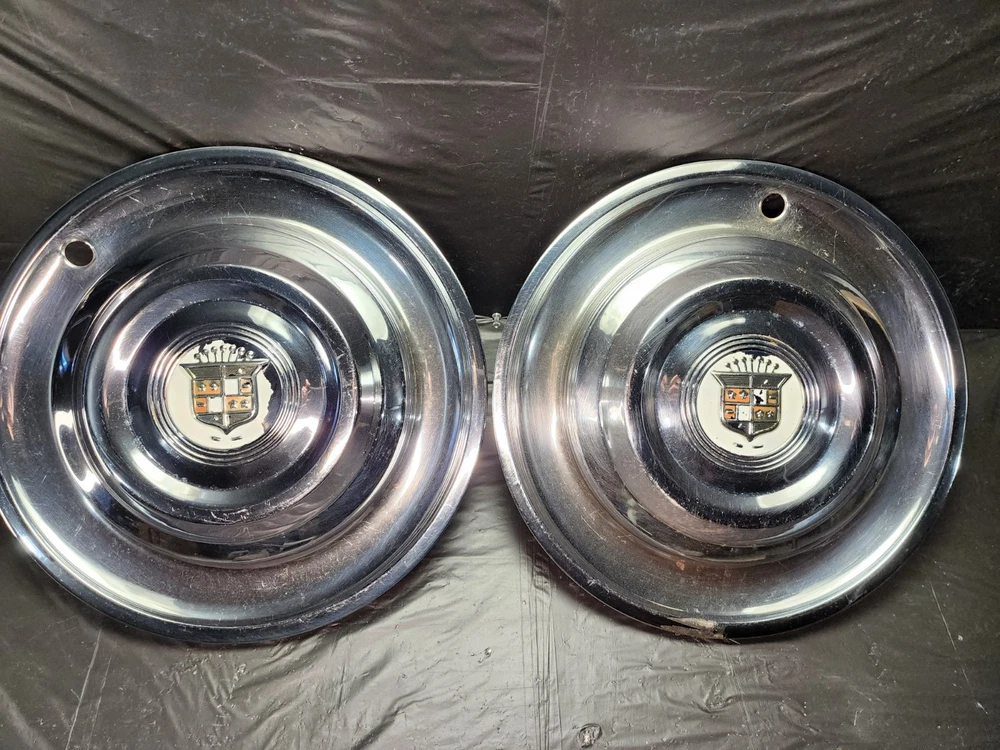 Vintage 40s 50s 60s 70s hub caps. 1954 1955 Vintage pair of Namsco National replacement hubcaps for Cadillac from the 50s. pair of 2 hubcaps wheel covers center caps. in good condition considering their age and being used. These are Used hubcaps off of old classic cars that were driven on the road and used, so please see photos for complete condition as they are not all perfect. Most have some fading, dings, scuffing, mineral staining, etc could use a good polishing to bring em back to full shine, but otherwise in beautiful condition. Check out more of my ebay page as we are going through and listing a ton of classic / vintage hubcaps from the the 20's 30's 40's 50's 60's 70's 80's 90's 00's and up. all different makes and models such as Ford Chevy Chevrolet GM Cadillac GMC camero nova Chevelle Nomad Bel Air Mercury Corvette Mustang Oldsmobile Pontiac Lincoln Dodge Plymouth Buick Chrysler Mopar Fairlane Volkswagen Cheiftain Challanger Charger 1500 4x4 muscle car hot rod rat rod Cars and Trucks 15in 14in 16in and so much more from full sets to sets of 2 and singles, you name it check us out!