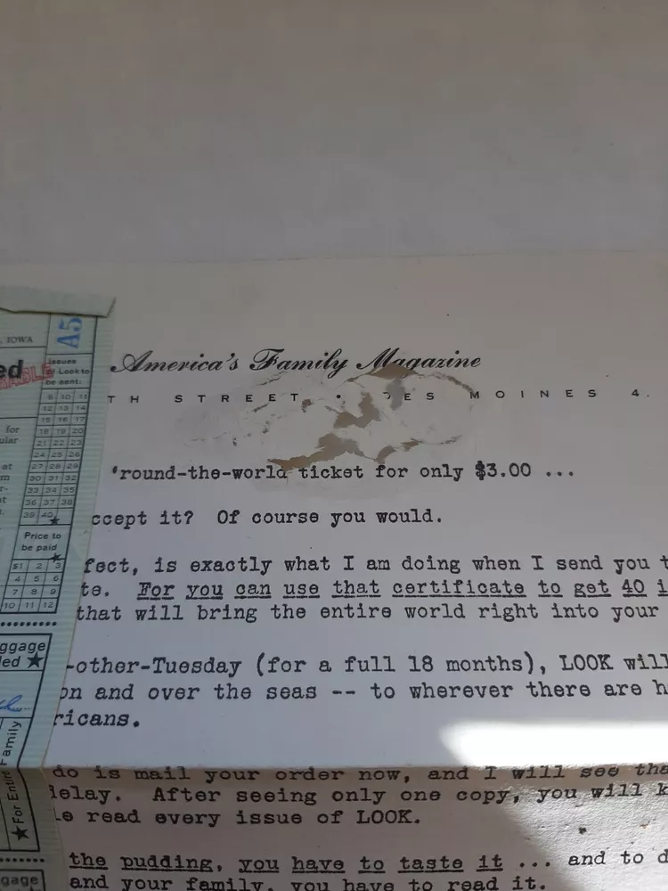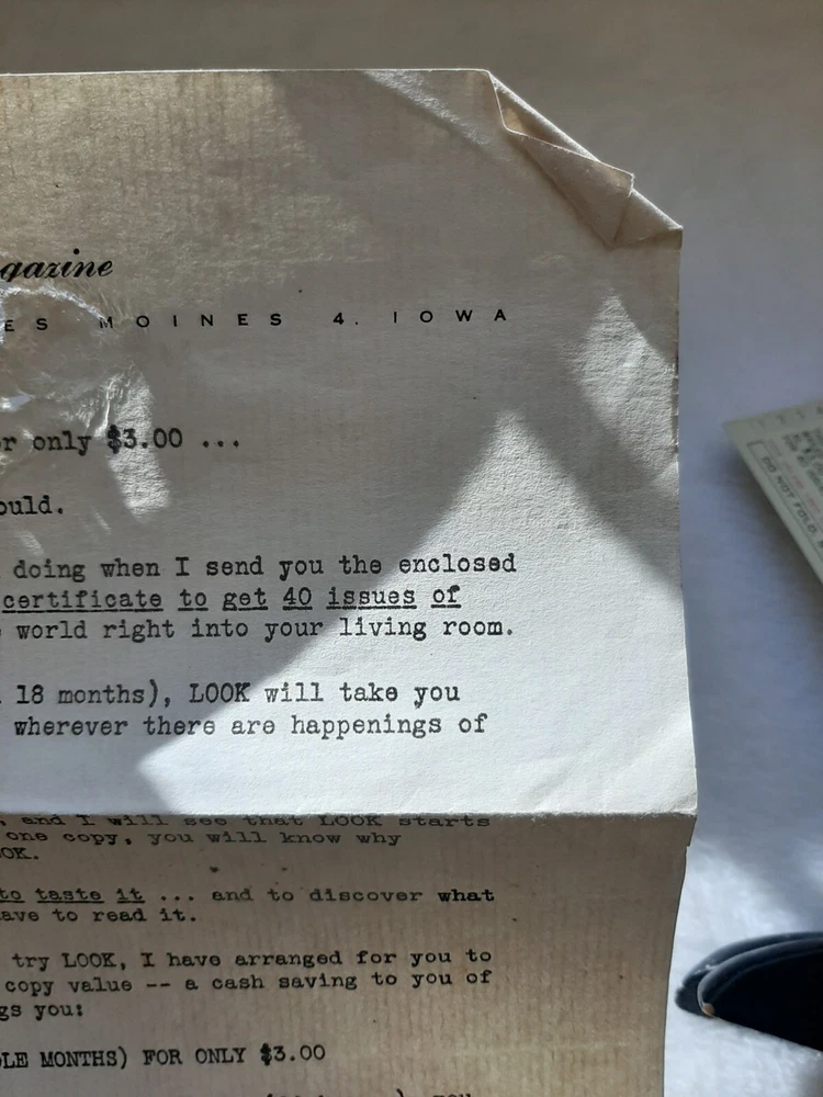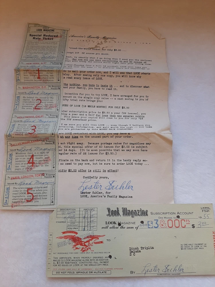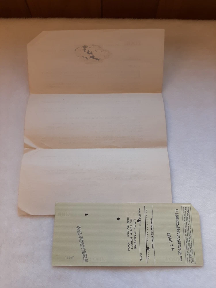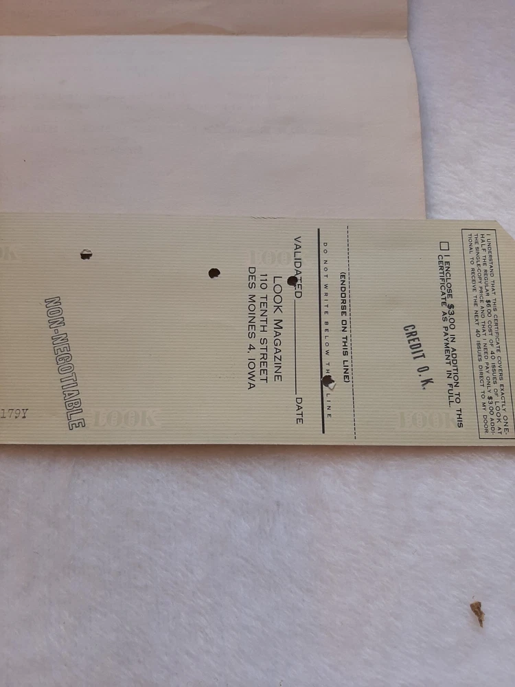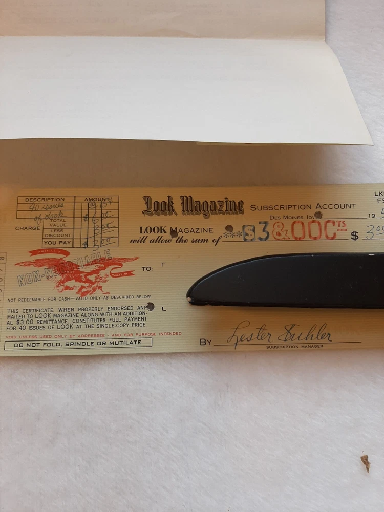 1955 Look Magazine Novelty Bank Check Discount Coupon Subscription Letter Vintage In good pre-owned condition may show signs of wear from use/handling/storage/display. Please view all pics for condition/details/flaws/issues. SOLD AS IS There is damage & folds to the paper please see all photos for details. There is/maybe marks/spots/dirt/debris please see photos 1-14, there is/maybe paint loss/sticker loss please see photos 1-14, there is lite discoloration please see photos 1-14, there are surface scratches to item please see photos 1-14, please see all photos for condition/issues/details.