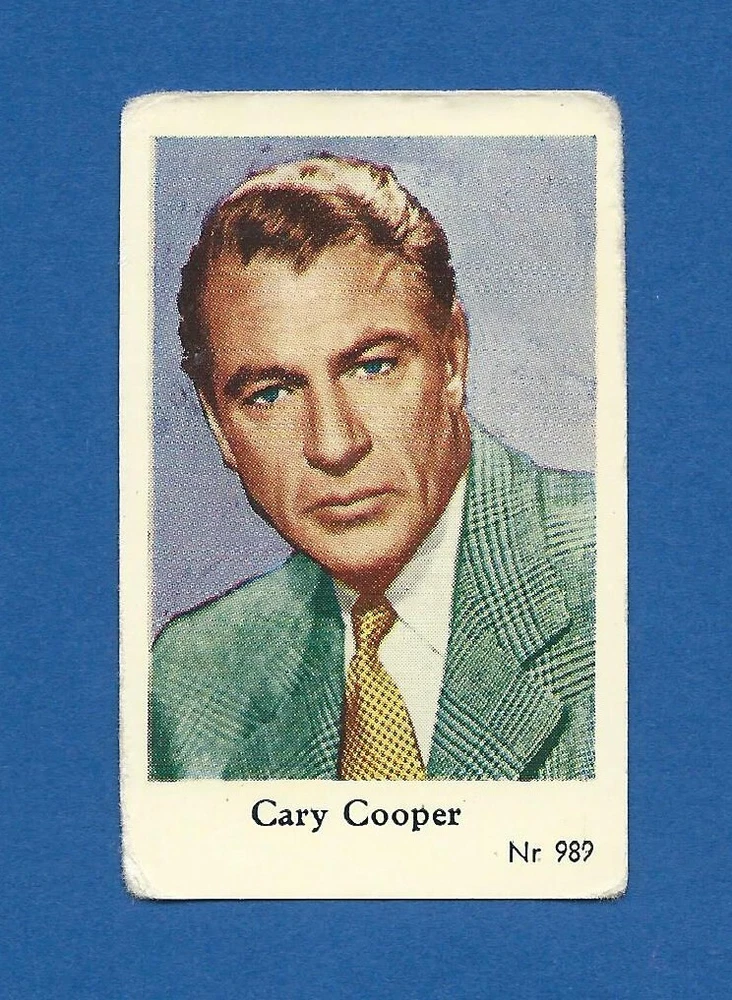 Set: Nr Language: Dutch Franchise: Film & TV Stars Original/Licensed Reprint: Original Type: Non-Sport Trading Card Card Number: 989 Featured Person/Artist: Gary Cooper Features: Base Set Country/Region of Manufacture: Netherlands Card Size: Roughly 4,5 x 7 cm