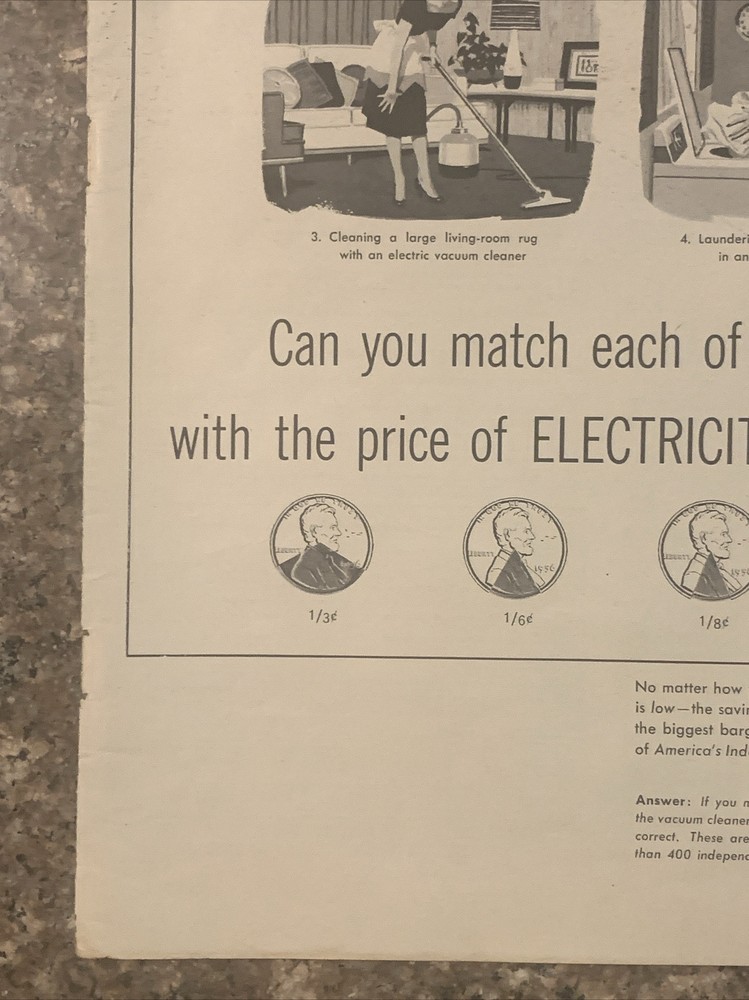This vintage 1956 magazine print ad features America's Independent Electric Light & Power Companies and the benefits of household electricity. The black and white design showcases the company's history and culture. Original approximate 10”x14” vintage magazine print ad.