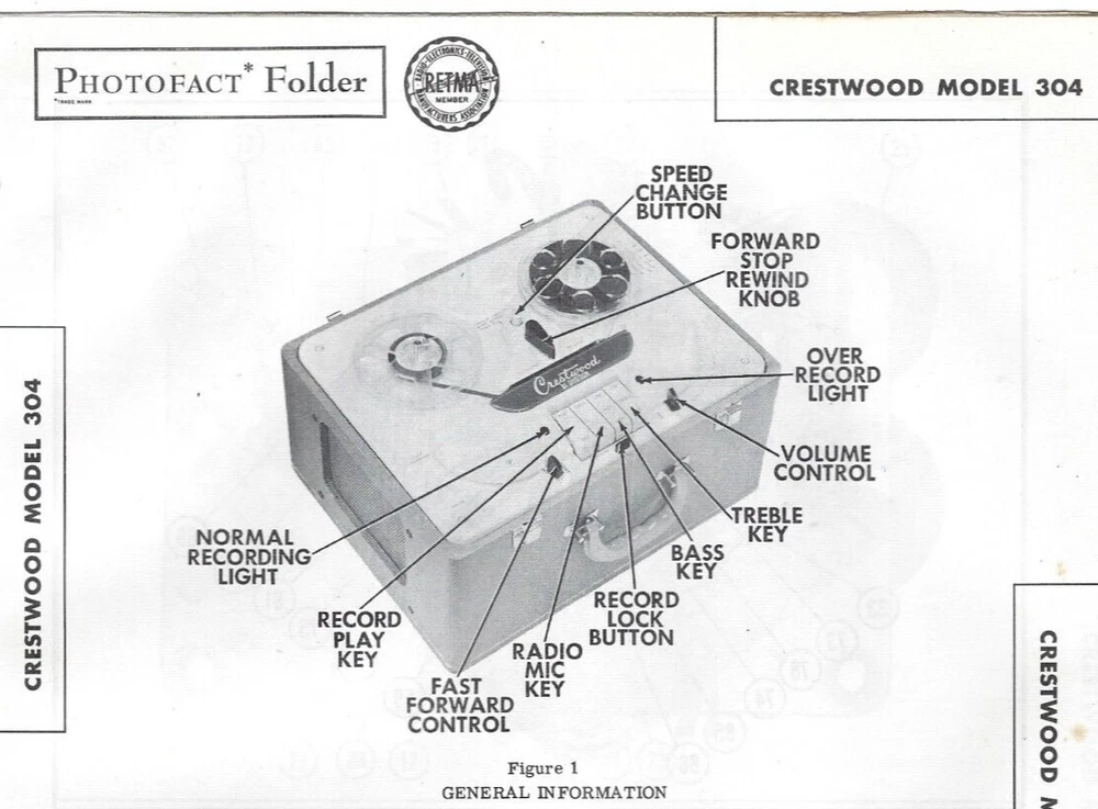 1956 CRESTWOOD 304 REEL To REEL Tape Recorder Photofact Instruction MANUAL - 12 pages, with instructions, photos, parts list, schematics, etc. Condition: - Good used condition, with minor storage wear. - Please see all photos, thanks.