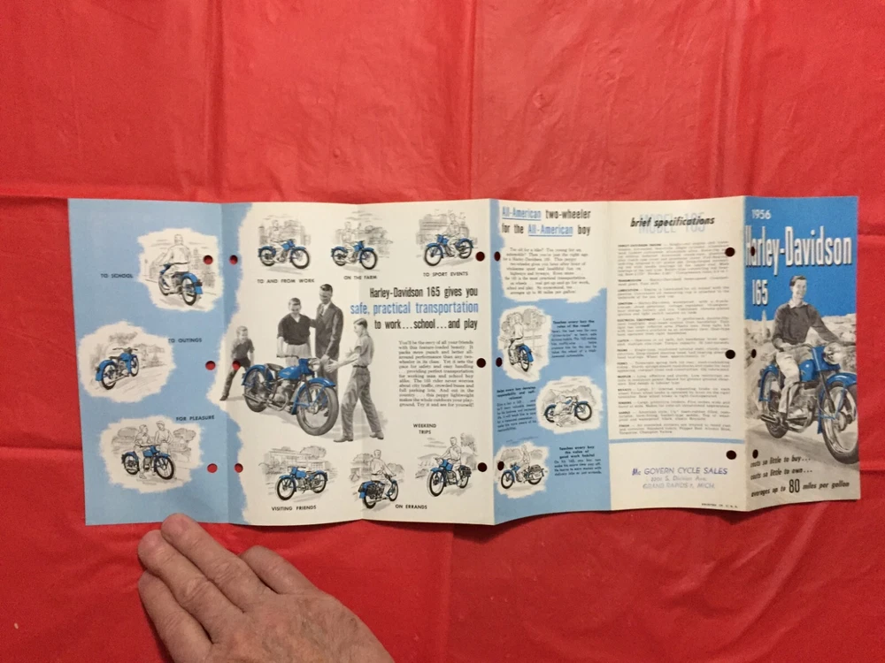 ITEM:::: This Listing is for an original 1956 HARLEY-DAVIDSON "MODEL '165' & FEATURES" Motorcycle Dealer Sales Brochure/Folder..... ... DIMENSIONS:::: About 8 1/2 by 3 3/4 inches and there are 12 pages with covers ...... CONDITION:::: The general overall condition is VG..... Punch holes,,,,, Stamp.. ... .. (Please refer to pictures & e-mail for details). ......... ABREVIATIONS:::: E=Excellent with no issues..... VG = Very Good with very lite issues..... G/VG = Good to Very Good with lite issues..... G + = Good+ with lite to moderate issues..... G = Good with moderate issues..... G - = Good- with moderate+ issues..... F/G = Fair to Good with quite a few issues..... F = Fair with many issues..... P = Poor with lots of issues..... Please let the pictures help you decide condition because they are an integral part of the description! Please e-mail with questions...... I will combine shipping & you will only pay $6.98 for shipping no matter how many items you accumulate! You can take up to 30 days to accumulate Items for combined shipping. Please drop me a note after your 1st win letting me know that you intend to wait to pay so that you can take advantage of combined shipping...... I will ship your Package to the address that you have registered on EBAY---Ergo, I will ship to the address that is on the shipping label when I print it from EBAY---Please do not ask me to ship to any other address---I will not do it! My goal is 100% satisfaction! I will refund 100% of your costs if you are not satisfied! Thanks for visiting!