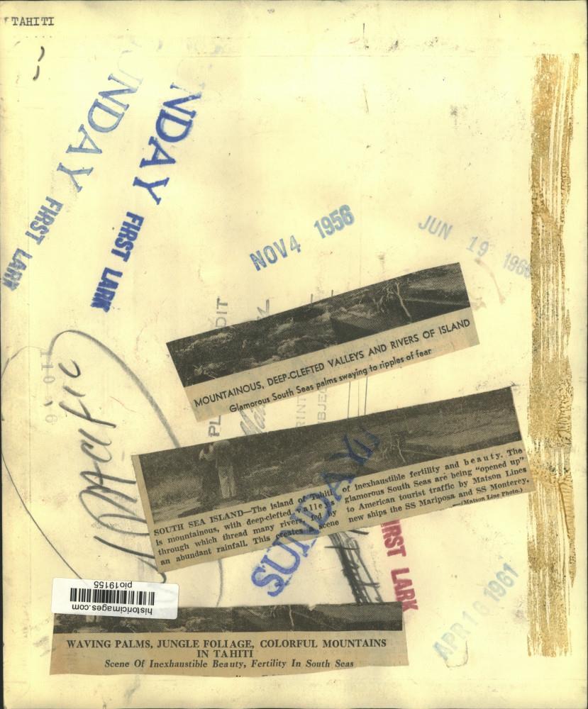 ebay template Note: Please study the images carefully to determine the condition of this vintage photograph, as it may not be in perfect condition. It may contain wrinkles, cracks, and possibly even tears due to its age and how it was handled before it got to us. A scanner may interpret colors and contrast differently than human eyes will, so it is possible that the actual photograph may be slightly darker or lighter in person. This vintage photograph is offered for sale as a collectible item and conveys no transfer of copyright. 1956 Press Photo Tourist couple by the river in Tahiti - pio19155 This is an original press photo. Tahiti. The island of Tahiti is mountainous, with deep-clefted valleys through which thread many rivers, fed by an abundant rainfall. This creates a scene of inexhaustible fertility and beauty. The glamorous South Seas are being "opened up" to American tourist traffic by Matson Lines's new ships the SS Mariposa and SS Monterey. Photo measures 10 x 8.25inches. Photo is dated 11-4-1956. PHOTO FRONT PHOTO BACK Historic Images Part Number: pio19155 FAQs Q: Can I just download a digital version instead? A: No, we sell only vintage originals and do not make or distribute any copies, including digital ones. Q: Do you combine shipping and invoices? A: Multiple photos won on the same seller ID combine automatically through the eBay checkout process. If you encounter problems with this, send us a message via eBay messaging and we will send you an invoice. Due to eBay limitations, we cannot combine items won on our different seller IDs for a single shipping charge. Q: How quickly do you ship the items once paid? A: We ship within one business day after your payment clears. If you do not receive an "order shipped" email from us by the close of the second business day from submitting payment, please e-mail us via eBay messaging. Q: How do you make sure my photograph arrives safely? A: We package each order between two cross-corrugated pieces of cardboard to ensure that the package is as difficult to bend as possible. We then wrap each order in a plastic sheet to help protect against moisture. We want you to rest assured that we take every precaution to ensure that the photograph you receive will be in the same condition in your care as it was in ours. Q: Will the "Historic Images" watermark be on my photo when I receive it? A: No. This is a digital watermark we use to protect our images. It is not printed on the photo. Q: What are your office hours? A: eBay for us is a business, and a very fun one to be in! We are open M-F 9 to 5 (CST). Therefore, we do not return e-mails and phone calls over the weekend. We observe the following holidays: New Years Day, Memorial Day, Fourth of July, Labor Day, Thanksgiving and the day after Thanksgiving, Christmas Eve and Christmas Day. Q: Where did all these vintage photos come from? A: These original vintage photographs are from various news service and newspaper photo archives from locations around the country including: Boston, Detroit, Tampa, Chicago, Denver, Seattle, New Orleans, Milwaukee, Portland, Spokane, and more. We do not copy or reproduce any photographs -- every item is a unique vintage piece that was housed in a news archive. Q: Can I use this photograph in my book/blog/website? A: The short answer is no. There is no transfer of copyright for republication or reproduction with these photographs when you purchase them, and only photographs taken before 1923 are currently automatically in the public domain. Permission from the copyright holder, which usually can be identified from the back of each photo, must be sought to republish or reproduce the image for any purpose. Q: Do you relist items (in case I miss an auction ending)? A: Auction items that receive no bids are relisted in our store (historicimages-store on eBay) as a fixed-price item and at a higher price than the starting auction price. Q: Do you leave feedback? A: Yes, we always leave feedback for buyers. Our software monitors when our buyers leave us feedback, then notifies us that we can leave feedback for the buyer. Rest assured, if you leave feedback, we will do the same! Check out our family of eBay IDs: historicimages01 Sports Photos historicimages02 Entertainment Photos historicimages03 Americana Photos historicimages04 International & War Photos historicimages05 Transportation Photos historicimages06 Photos of All Subjects historicimages07 Entertainment Photos historicimages08 Newsworthy Photos historicimages09 Entertainment Photos historicimages10 Sports Photos historicimages-store Our largest fixed-price selection historicimages-gallery Hand-picked photos Saturday night auctions About Us Historic Images was formed in September 2009, with a handful of scanners working out of a basement to digitize newspaper photo archives. We have since moved out of the basement, and we can now archive thousands of photos per day. Our company has worked with magazines and newspapers from Detroit, Boston, Denver, Seattle, Tampa, Chicago, and New Orleans, just to name a few. We are constantly adding to our inventory, and have assembled an archive of millions of photos to date. As our company evolved, we began our eBay business, which brings thousands of fresh auctions per week to the world's largest online auction marketplace. Our custom software systems and team of great employees allow us to efficiently scan and sell large photo archives online. At the very core of our company's DNA is a strong commitment to customer satisfaction and strict integrity for our product. Our promise to you is that we will do everything in our power to provide you a great buying experience. Copyright 2009 - Present, Historic Images, Inc. Sell Smarter with Kyozou. Inventory and Ecommerce Management