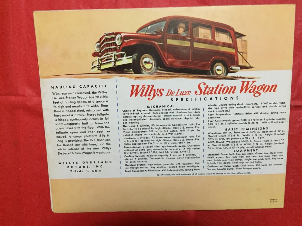 ITEM:::: This Listing is for an original 1956 WILLYS "DE LUXE STATION WAGON" Truck Car Dealer Sales Brochure/Foldout.. ..... DIMENSIONS:::: About 9 by 7 1/2 inches and there are 8 pages with covers ....... CONDITION:::: The Condition is generally mostly G/VG..... Stamp.... ... (Please refer to pictures & e-mail for details). ......... ABREVIATIONS:::: E=Excellent with no issues..... VG = Very Good with very lite issues..... G/VG = Good to Very Good with lite issues..... G + = Good+ with lite to moderate issues..... G = Good with moderate issues..... G - = Good- with moderate+ issues..... F/G = Fair to Good with quite a few issues..... F = Fair with many issues..... P = Poor with lots of issues..... Please let the pictures help you decide condition because they are an integral part of the description! Please e-mail with questions...... I will combine shipping & you will only pay $6.98 for shipping no matter how many items you accumulate! You can take up to 30 days to accumulate Items for combined shipping. Please drop me a note after your 1st win letting me know that you intend to wait to pay so that you can take advantage of combined shipping...... I will ship your Package to the address that you have registered on EBAY---Ergo, I will ship to the address that is on the shipping label when I print it from EBAY---Please do not ask me to ship to any other address---I will not do it! My goal is 100% satisfaction! I will refund 100% of your costs if you are not satisfied! Thanks for visiting!