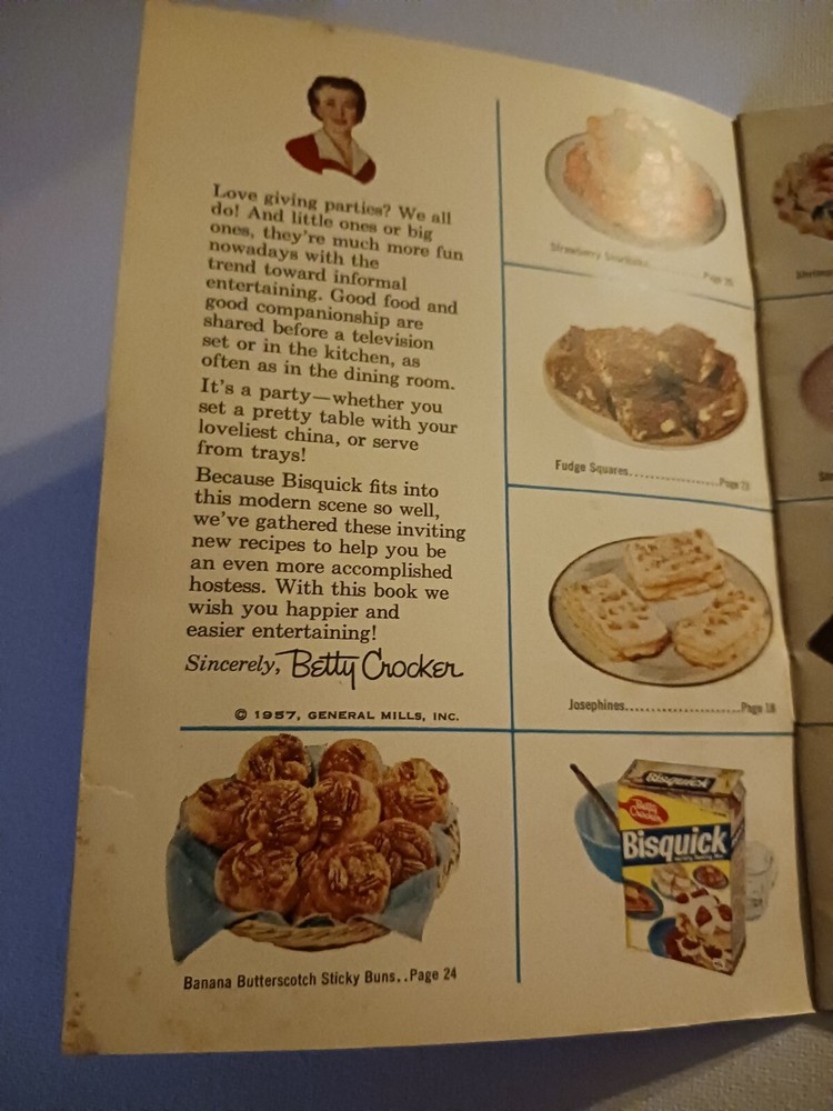 This vintage cookbook from 1957 features Betty Crocker's Bisquick Party Book, filled with recipes and party ideas. The blue cover showcases an image of a delicious cake, and inside you'll find a collection of original recipes and baking tips. The book is in its original condition and comes from the United States. It is a great addition to any collection of vintage cookbooks or advertising memorabilia. Whether you're a fan of Betty Crocker or simply love baking, this book is a must-have. 67 year old book may show signs of minor wear