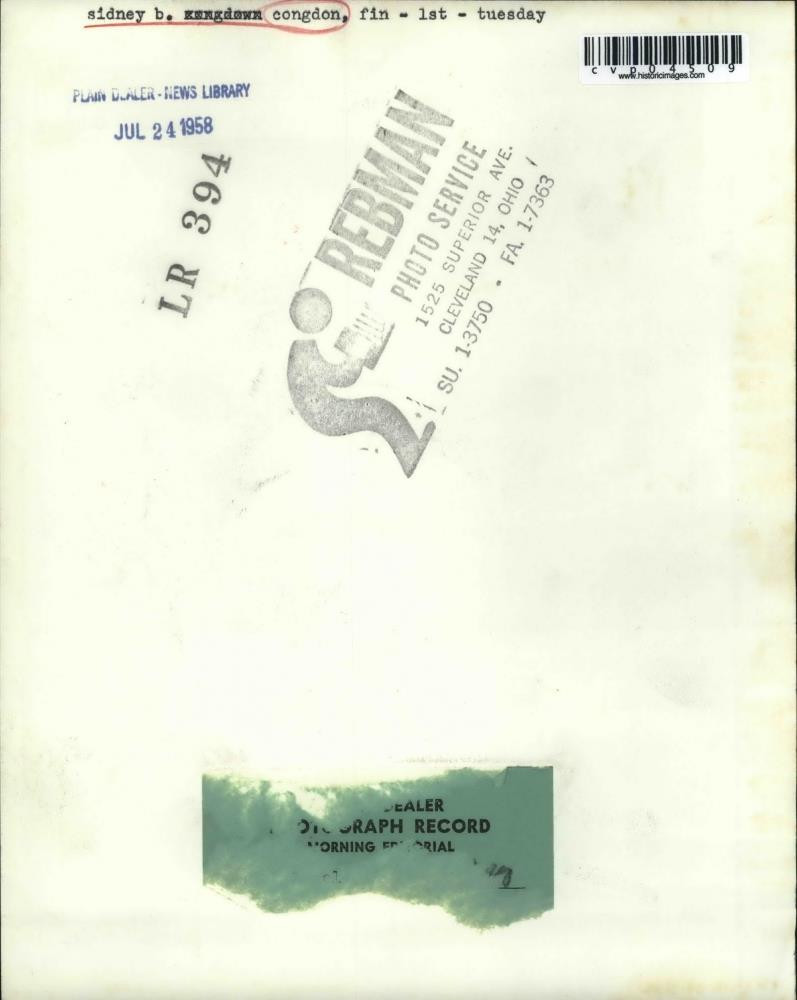 ebay template Note: Please study the images carefully to determine the condition of this vintage photograph, as it may not be in perfect condition. It may contain wrinkles, cracks, and possibly even tears due to its age and how it was handled before it got to us. A scanner may interpret colors and contrast differently than human eyes will, so it is possible that the actual photograph may be slightly darker or lighter in person. This vintage photograph is offered for sale as a collectible item and conveys no transfer of copyright. 1958 Press Photo Sidney B Congdon - cvp04509 This is an original press photo. Sidney B Congdon Photo measures 8 x 10.25inches. Photo is dated 7-24-1958. PHOTO FRONT PHOTO BACK Historic Images Part Number: cvp04509 FAQs Q: Can I just download a digital version instead? A: No, we sell only vintage originals and do not make or distribute any copies, including digital ones. Q: Do you combine shipping and invoices? A: Multiple photos won on the same seller ID combine automatically through the eBay checkout process. If you encounter problems with this, send us a message via eBay messaging and we will send you an invoice. Due to eBay limitations, we cannot combine items won on our different seller IDs for a single shipping charge. Q: How quickly do you ship the items once paid? A: We ship within one business day after your payment clears. If you do not receive an "order shipped" email from us by the close of the second business day from submitting payment, please e-mail us via eBay messaging. Q: How do you make sure my photograph arrives safely? A: We package each order between two cross-corrugated pieces of cardboard to ensure that the package is as difficult to bend as possible. We then wrap each order in a plastic sheet to help protect against moisture. We want you to rest assured that we take every precaution to ensure that the photograph you receive will be in the same condition in your care as it was in ours. Q: Will the "Historic Images" watermark be on my photo when I receive it? A: No. This is a digital watermark we use to protect our images. It is not printed on the photo. Q: What are your office hours? A: eBay for us is a business, and a very fun one to be in! We are open M-F 9 to 5 (CST). Therefore, we do not return e-mails and phone calls over the weekend. We observe the following holidays: New Years Day, Memorial Day, Fourth of July, Labor Day, Thanksgiving and the day after Thanksgiving, Christmas Eve and Christmas Day. Q: Where did all these vintage photos come from? A: These original vintage photographs are from various news service and newspaper photo archives from locations around the country including: Boston, Detroit, Tampa, Chicago, Denver, Seattle, New Orleans, Milwaukee, Portland, Spokane, and more. We do not copy or reproduce any photographs -- every item is a unique vintage piece that was housed in a news archive. Q: Can I use this photograph in my book/blog/website? A: The short answer is no. There is no transfer of copyright for republication or reproduction with these photographs when you purchase them, and only photographs taken before 1923 are currently automatically in the public domain. Permission from the copyright holder, which usually can be identified from the back of each photo, must be sought to republish or reproduce the image for any purpose. Q: Do you relist items (in case I miss an auction ending)? A: Auction items that receive no bids are relisted in our store (historicimages-store on eBay) as a fixed-price item and at a higher price than the starting auction price. Q: Do you leave feedback? A: Yes, we always leave feedback for buyers. Our software monitors when our buyers leave us feedback, then notifies us that we can leave feedback for the buyer. Rest assured, if you leave feedback, we will do the same! Check out our family of eBay IDs: historicimages01 Sports Photos historicimages02 Entertainment Photos historicimages03 Americana Photos historicimages04 International & War Photos historicimages05 Transportation Photos historicimages06 Photos of All Subjects historicimages07 Entertainment Photos historicimages08 Newsworthy Photos historicimages09 Entertainment Photos historicimages10 Sports Photos historicimages-store Our largest fixed-price selection historicimages-gallery Hand-picked photos Saturday night auctions About Us Historic Images was formed in September 2009, with a handful of scanners working out of a basement to digitize newspaper photo archives. We have since moved out of the basement, and we can now archive thousands of photos per day. Our company has worked with magazines and newspapers from Detroit, Boston, Denver, Seattle, Tampa, Chicago, and New Orleans, just to name a few. We are constantly adding to our inventory, and have assembled an archive of millions of photos to date. As our company evolved, we began our eBay business, which brings thousands of fresh auctions per week to the world's largest online auction marketplace. Our custom software systems and team of great employees allow us to efficiently scan and sell large photo archives online. At the very core of our company's DNA is a strong commitment to customer satisfaction and strict integrity for our product. Our promise to you is that we will do everything in our power to provide you a great buying experience. Copyright 2009 - Present, Historic Images, Inc. Sell Smarter with Kyozou. Inventory and Ecommerce Management