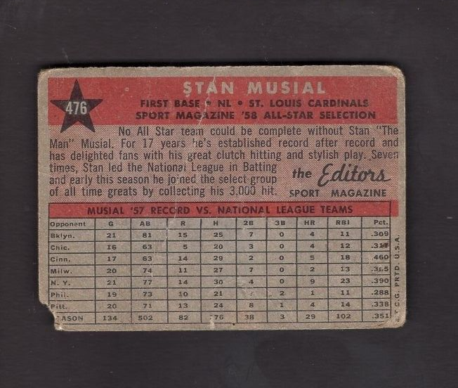 1958 Topps # 476 Stan Musial in poor condition with wear, creases and missing the top left corner. SHIPPING IS FREE. Check out the many other star cards as well as the Topps and Bowman single cards in my e-bay store. If you think you might buy multiple items from any seller that offers combined shipping, use the "Add To Cart" option under the "Buy It Now" button instead of the buy-it-now, and this will combine your purchases into one shipping charge as you add more items to your cart and purchase. Only make your payment after you have added all the items you want into your cart - you should then see that there is one charge for shipping when you go to make your payment. (jcm)