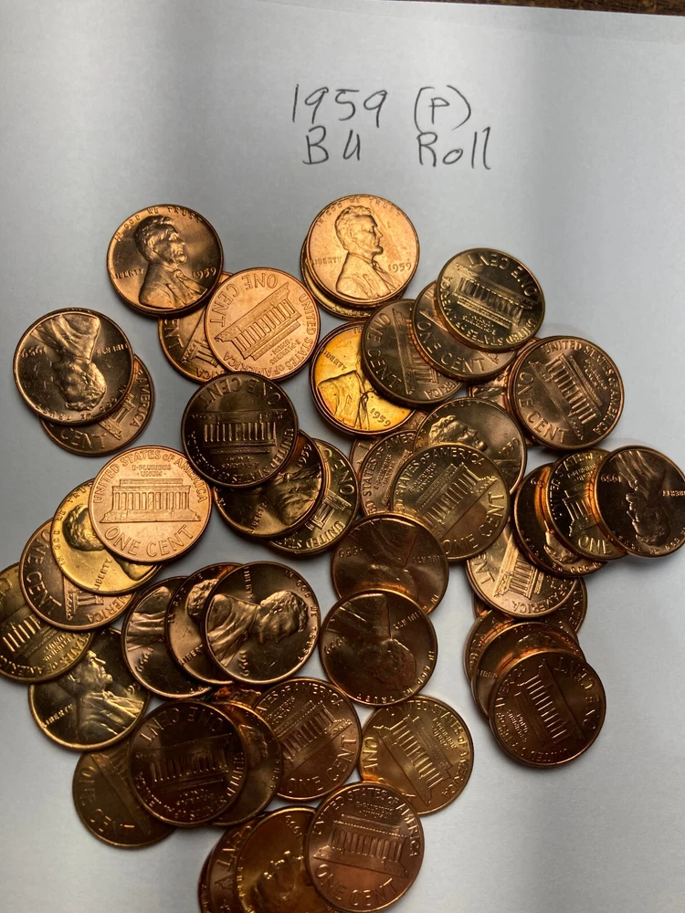 You are purchasing a full roll, 50 coins, of 1959 (P) Lincoln memorial cents that are in uncirculated condition. The photo shows a typical roll of the rolls that I am selling. I have several of these rolls to sell. Please read a note about shipping: I strive to ship at my cost. If you pay more at checkout I can refund the overage you may pay. Rolls and lots: $4.50 for the first roll and $1.50 for each additional roll; up to $8.50. I can ship up to 30 rolls (paper wrapped) for $8.50. Single coins up to 3 coins sold at $20 or less: $1.11 for eBay standard envelope. I ship all of these at 3oz since it is safer that way. Beyond $20 value shipping is $3.50. The best way to handle multiple item purchases is to put them in your cart and then ask for an invoice from seller. That way I can provide these shipping prices without having to issue a refund. I am not in this business to make money on shipping but I must charge costs involved. There is no such thing as free shipping. It is paid for by someone, usually in the cost of the item.