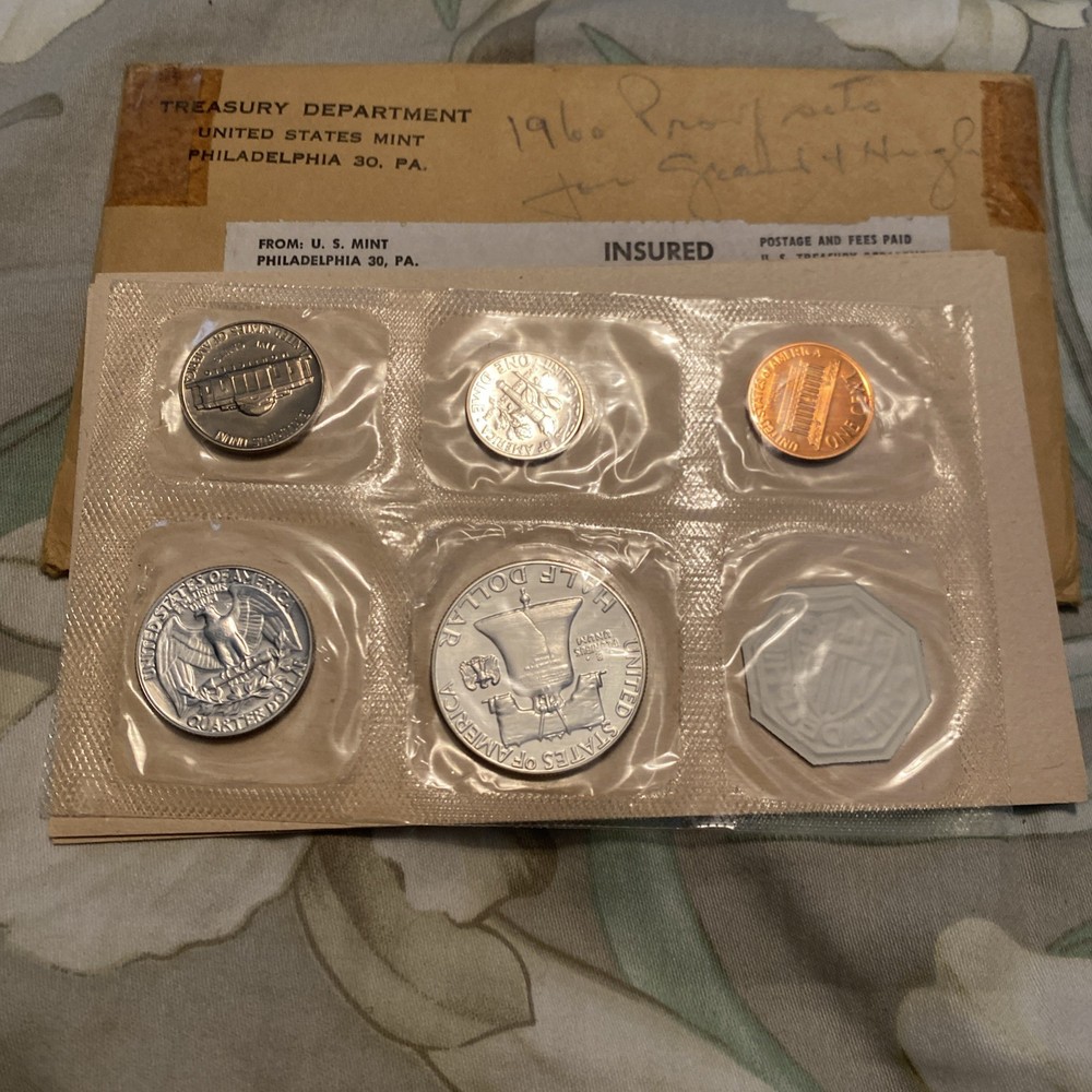The product is a 1960 proof set of 5 US coins, each composed of 90% silver, minted by the US Mint in Philadelphia. The set includes coins with a denomination of 50 cents and a total precious metal content of 0.61 oz. The coins are uncirculated and come in an original envelope, making it a valuable addition to any coin collection.3