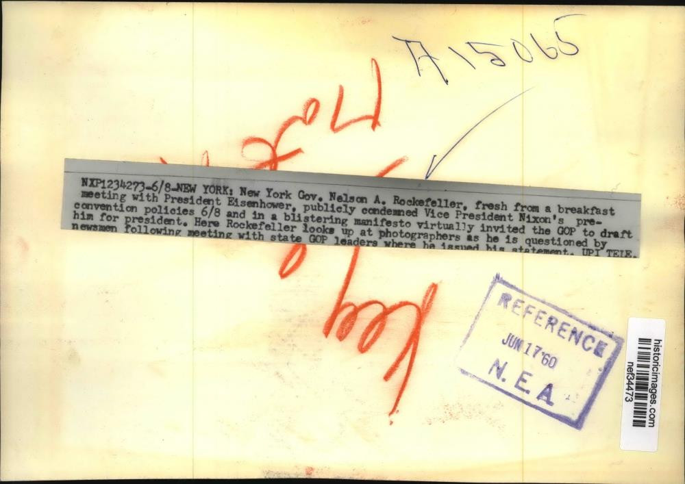 ebay template Note: Please study the images carefully to determine the condition of this vintage photograph, as it may not be in perfect condition. It may contain wrinkles, cracks, and possibly even tears due to its age and how it was handled before it got to us. A scanner may interpret colors and contrast differently than human eyes will, so it is possible that the actual photograph may be slightly darker or lighter in person. This vintage photograph is offered for sale as a collectible item and conveys no transfer of copyright. 1960 Press Photo Nelson Rockefeller with Reporters in New York - nef34473 This is an original press photo. Photo measures 9 x 6.25inches. Photo is dated 06-08-1960. PHOTO FRONT PHOTO BACK Historic Images Part Number: nef34473 FAQs Q: Can I just download a digital version instead? A: No, we sell only vintage originals and do not make or distribute any copies, including digital ones. Q: Do you combine shipping and invoices? A: Multiple photos won on the same seller ID combine automatically through the eBay checkout process. If you encounter problems with this, send us a message via eBay messaging and we will send you an invoice. Due to eBay limitations, we cannot combine items won on our different seller IDs for a single shipping charge. Q: How quickly do you ship the items once paid? A: We ship within one business day after your payment clears. If you do not receive an "order shipped" email from us by the close of the second business day from submitting payment, please e-mail us via eBay messaging. Q: How do you make sure my photograph arrives safely? A: We package each order between two cross-corrugated pieces of cardboard to ensure that the package is as difficult to bend as possible. We then wrap each order in a plastic sheet to help protect against moisture. We want you to rest assured that we take every precaution to ensure that the photograph you receive will be in the same condition in your care as it was in ours. Q: Will the "Historic Images" watermark be on my photo when I receive it? A: No. This is a digital watermark we use to protect our images. It is not printed on the photo. Q: What are your office hours? A: eBay for us is a business, and a very fun one to be in! We are open M-F 9 to 5 (CST). Therefore, we do not return e-mails and phone calls over the weekend. We observe the following holidays: New Years Day, Memorial Day, Fourth of July, Labor Day, Thanksgiving and the day after Thanksgiving, Christmas Eve and Christmas Day. Q: Where did all these vintage photos come from? A: These original vintage photographs are from various news service and newspaper photo archives from locations around the country including: Boston, Detroit, Tampa, Chicago, Denver, Seattle, New Orleans, Milwaukee, Portland, Spokane, and more. We do not copy or reproduce any photographs -- every item is a unique vintage piece that was housed in a news archive. Q: Can I use this photograph in my book/blog/website? A: The short answer is no. There is no transfer of copyright for republication or reproduction with these photographs when you purchase them, and only photographs taken before 1923 are currently automatically in the public domain. Permission from the copyright holder, which usually can be identified from the back of each photo, must be sought to republish or reproduce the image for any purpose. Q: Do you relist items (in case I miss an auction ending)? A: Auction items that receive no bids are relisted in our store (historicimages-store on eBay) as a fixed-price item and at a higher price than the starting auction price. Q: Do you leave feedback? A: Yes, we always leave feedback for buyers. Our software monitors when our buyers leave us feedback, then notifies us that we can leave feedback for the buyer. Rest assured, if you leave feedback, we will do the same! Check out our family of eBay IDs: historicimages01 Sports Photos historicimages02 Entertainment Photos historicimages03 Americana Photos historicimages04 International & War Photos historicimages05 Transportation Photos historicimages06 Photos of All Subjects historicimages07 Entertainment Photos historicimages08 Newsworthy Photos historicimages09 Entertainment Photos historicimages10 Sports Photos historicimages-store Our largest fixed-price selection historicimages-gallery Hand-picked photos Saturday night auctions About Us Historic Images was formed in September 2009, with a handful of scanners working out of a basement to digitize newspaper photo archives. We have since moved out of the basement, and we can now archive thousands of photos per day. Our company has worked with magazines and newspapers from Detroit, Boston, Denver, Seattle, Tampa, Chicago, and New Orleans, just to name a few. We are constantly adding to our inventory, and have assembled an archive of millions of photos to date. As our company evolved, we began our eBay business, which brings thousands of fresh auctions per week to the world's largest online auction marketplace. Our custom software systems and team of great employees allow us to efficiently scan and sell large photo archives online. At the very core of our company's DNA is a strong commitment to customer satisfaction and strict integrity for our product. Our promise to you is that we will do everything in our power to provide you a great buying experience. Copyright 2009 - Present, Historic Images, Inc. Sell Smarter with Kyozou. Inventory and Ecommerce Management