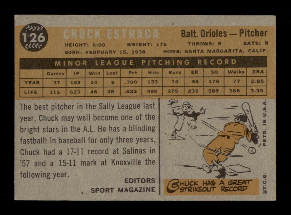 Year: 1960 Player: Chuck Estrada Sport: Baseball Graded: No Original/Reprint: Original Season: 1960 Series: Varies Card Manufacturer: Topps