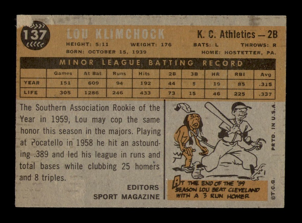 Year: 1960 Season: 1960 Original/Reprint: Original Graded: No Player: Lou Klimchock Series: Varies Sport: Baseball Card Manufacturer: Topps