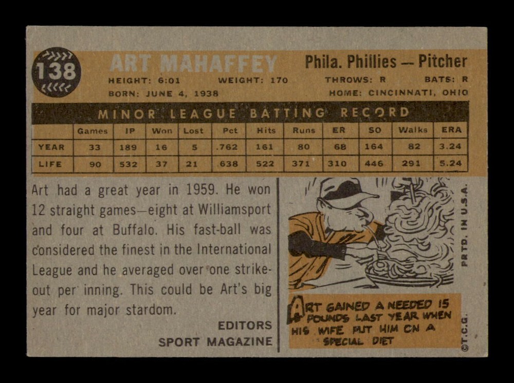 Graded: No Card Manufacturer: Topps Player: Art Mahaffey Season: 1960 Original/Reprint: Original Year: 1960 Series: Varies Sport: Baseball
