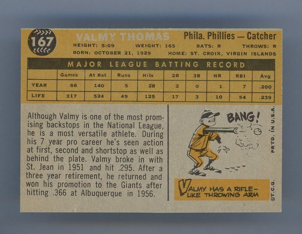 Team: Philadelphia Phillies Language: English Material: Card Stock League: Major League (MLB) Card Number: 167 Original/Licensed Reprint: Original Season: 1960 Type: Sports Trading Card Year Manufactured: 1960 Sport: Baseball Autographed: No Vintage: Yes Card Name: Valmy Thomas Manufacturer: Topps Card Size: Standard Card Condition: NEAR MINT Country/Region of Manufacture: United States Player/Athlete: Valmy Thomas Set: 1960 Topps