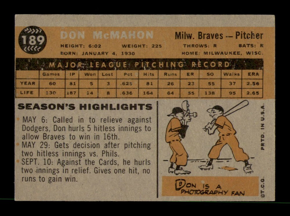 Card Manufacturer: Topps Graded: No Series: Varies Original/Reprint: Original Sport: Baseball Year: 1960 Player: Don McMahon Season: 1960