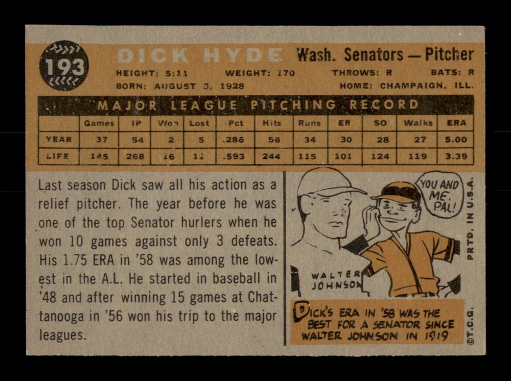 Player: Dick Hyde Card Manufacturer: Topps Season: 1960 Year: 1960 Graded: No Sport: Baseball Series: Varies Original/Reprint: Original