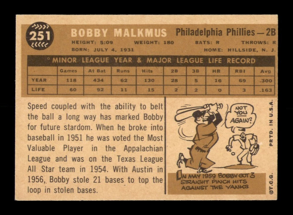 1960 Topps #251 Bobby Malkmus EX-MNT Condition – OBGcards