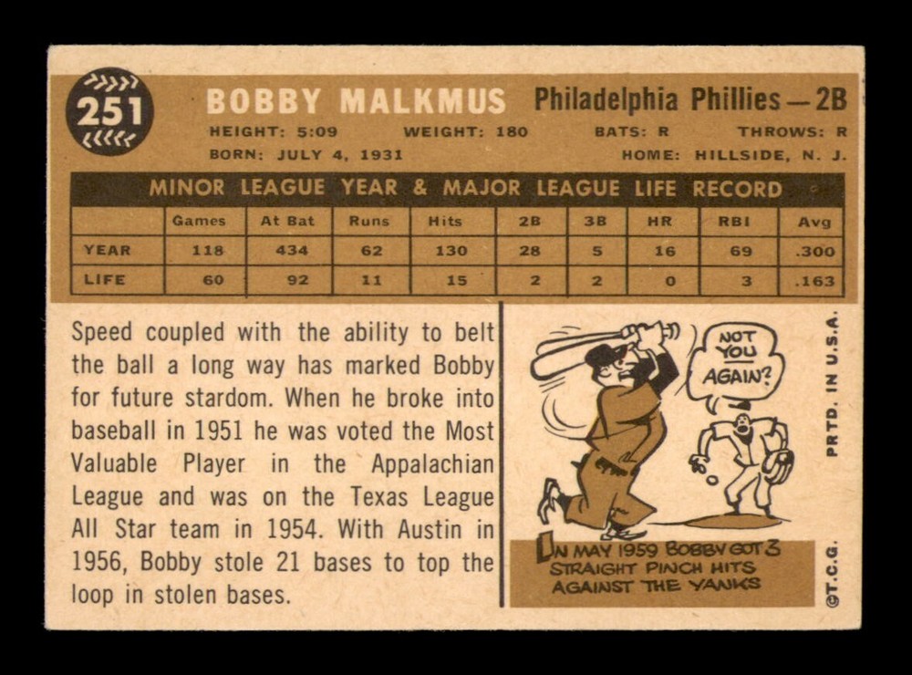 1960 Topps #251 Bobby Malkmus EX-MT Condition OBGcards Vintage Baseball Break