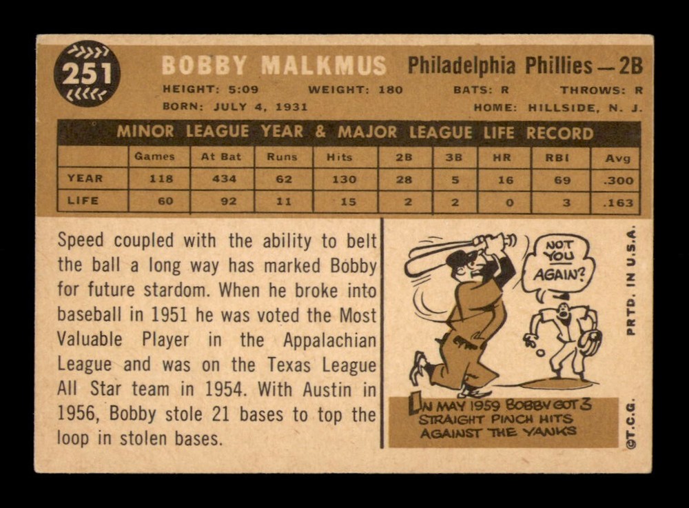 1960 Topps #251 Bobby Malkmus EX-MT Vintage Baseball Card OBGcards