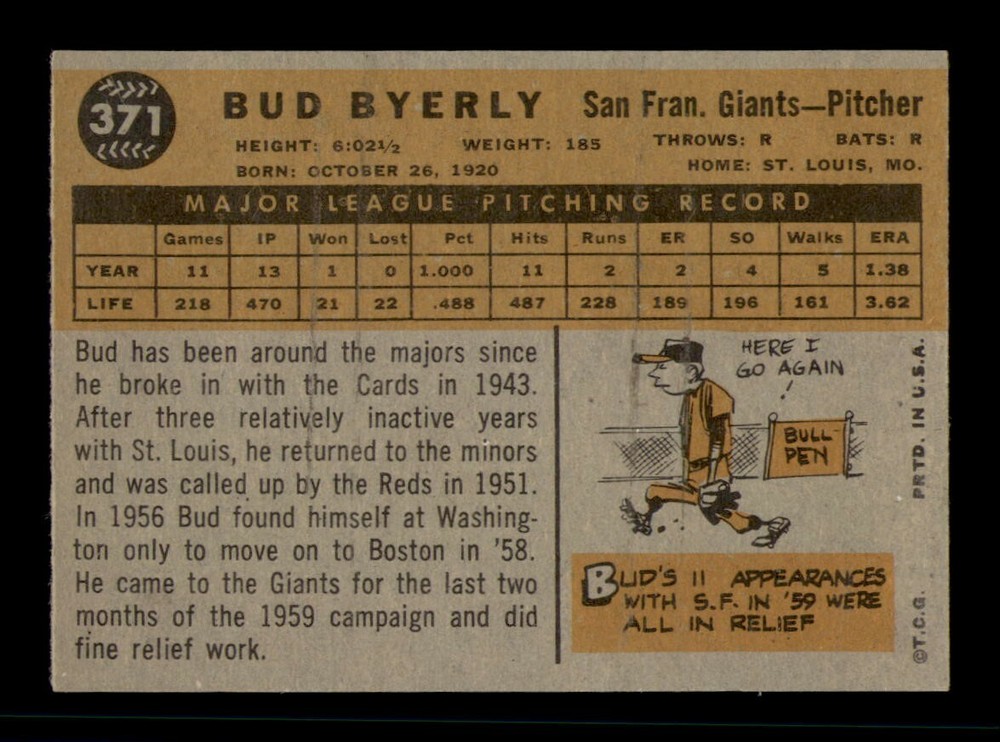 Original/Reprint: Original Year: 1960 Card Manufacturer: Topps Sport: Baseball Season: 1960 Player: Bud Byerly Series: Varies Graded: No