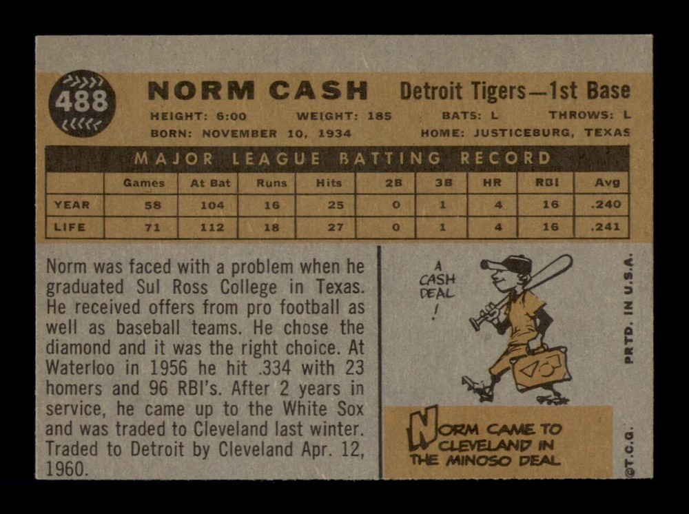 1960 Topps #488 Norm Cash NM Vintage Baseball Card OBGcards