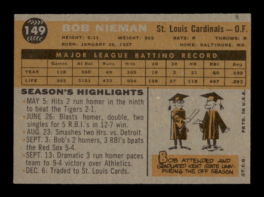 Year: 1960 Series: Varies Sport: Baseball Season: 1960 Card Manufacturer: Topps Original/Reprint: Original Graded: No Player: Bob Nieman