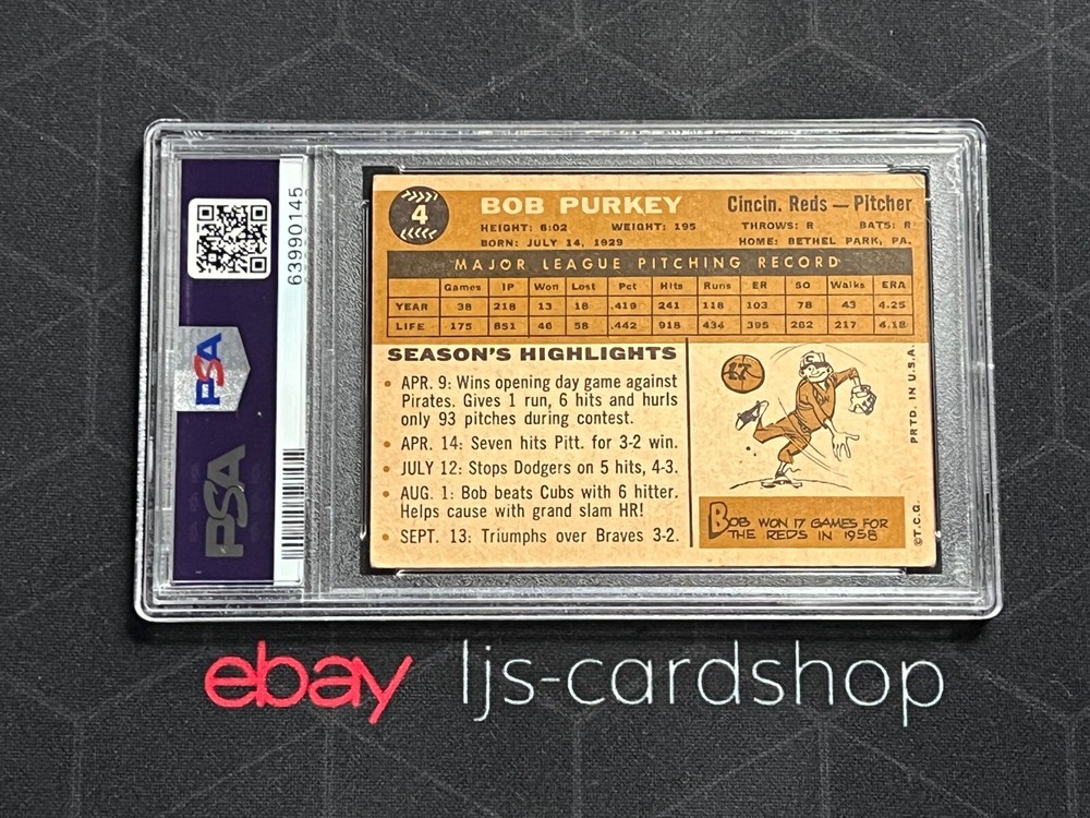 This vintage 1960 Topps Bob Purkey card is a fantastic find for baseball collectors! The PSA 7 grade means it's in great condition for its age, preserving the classic Reds pitcher's image beautifully. A true gem from the golden era of baseball cards, it’s perfect for fans of the sport’s history or anyone building a serious collection. The design and nostalgia make it stand out—definitely worth adding to your lineup!