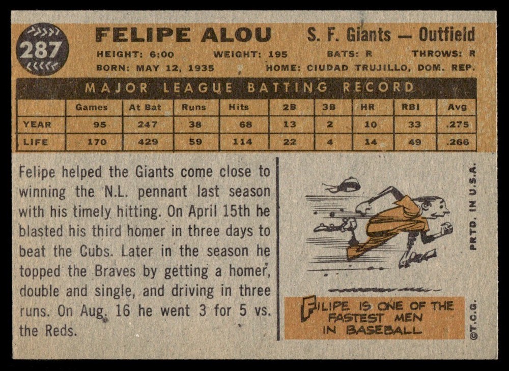 About Me Other Listings Feedback Add to Favorites Contact Me Iowa Discount Sportscards 1960 Topps Felipe Alou San Francisco Giants #287 No stock photo / These are real scans or pictures Details Description: Felipe Alou Category: Baseball Year: 1960 Product: Topps Team: San Francisco Giants Card Number: 287 Dimensions: 3½" x 2½" SKU: BL B0002 R01 A (47) Listing By Kronocard trading cards software v2.8.2.3