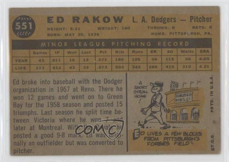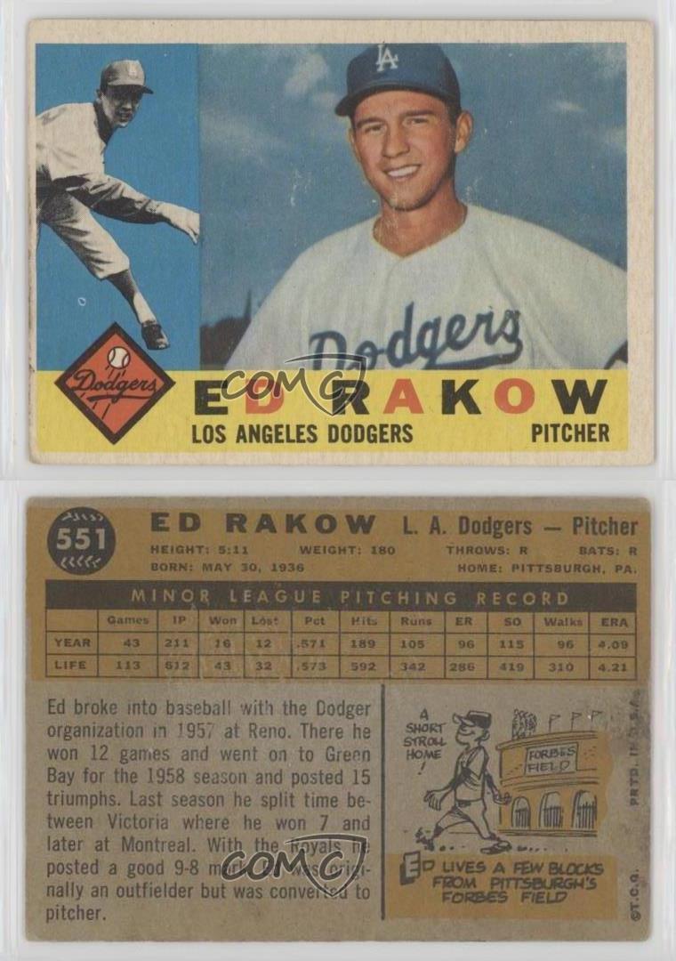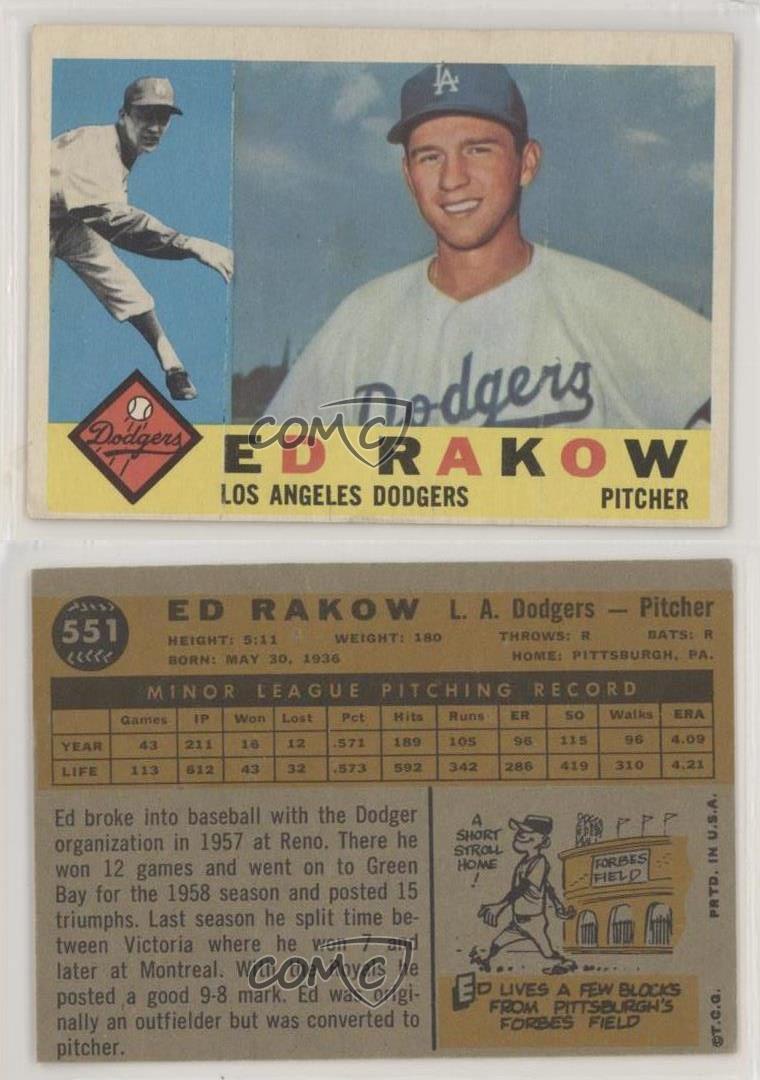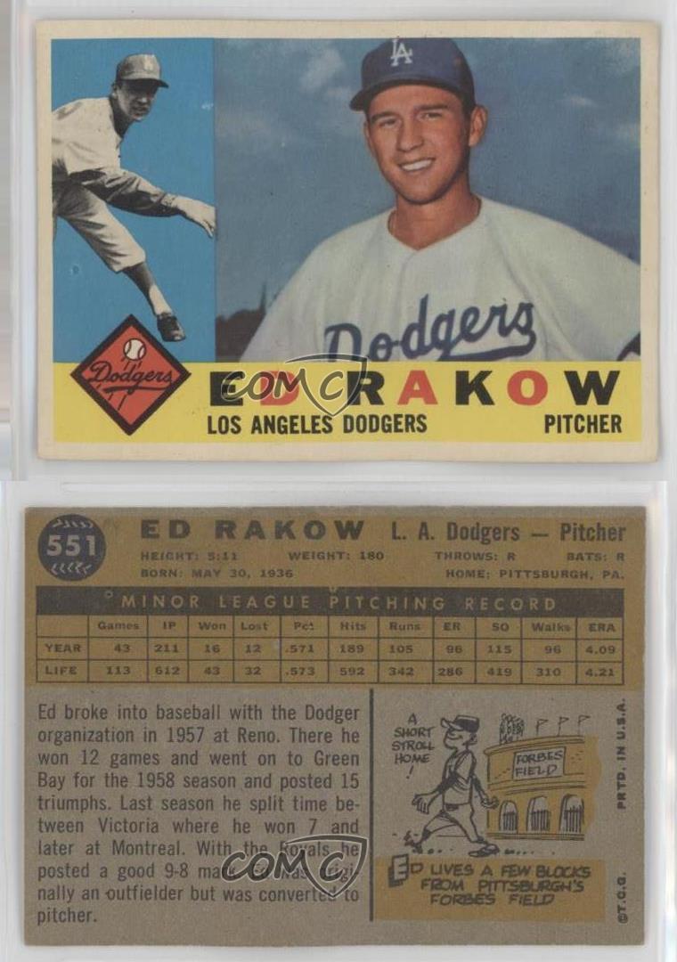 1960 Topps - [Base] #551 High # - Ed Rakow - RC (Rookie Card) - Baseball Card - Featuring the Los Angeles Dodgers - Featuring Ed Rakow Search for more: 1960 Topps Search for more: 1960 Topps - [Base] View all of our Listings Auctions Buy It Now About Us Located in the beautiful Pacific Northwest, COMC (Check Out My Cards) is the world's largest consignment service for trading card singles. More than 10,000 people have used our consignment service to list over 50 million trading cards. Find out how we can help you consign your items on eBay by contacting us through eBay messaging. COMC -- "The Safe & Easy Way to Buy & Sell" Representative Image - Select Specific Item above to see image of actual item Representative Image - Select Specific Item above to see image of actual item Raw Condition for Modern Cards Unless otherwise noted, raw modern cards are listed in Near Mint-Mint condition or better. A NM-MT card appears to be Mint at first glance, but upon closer inspection, may exhibit some of the following: minor print defects (e.g. roller marks, print line, dimple), minor scratches, slight edge wear, and slight corner wear. Centering is clearly visible in the images provided and does not factor into our condition assessment. Raw Condition for Vintage Cards Unless otherwise noted, raw vintage cards are listed in Excellent condition or better. An EX card may exhibit some of the following: minor rounding of corners, surface wear, print defects, light scratches, and slight edge wear/chipping. Centering is clearly visible in the images provided and does not factor into our condition assessment. Domestic Shipping Combined shipping for multiple items is available. To receive combined shipping, please ensure all desired items are in your eBay shopping cart before proceeding to checkout. eBay limits orders to 40 items per order. We automatically combine multiple orders placed on the same day. If you place multiple orders on the same day, please contact us to request a refund of applicable shipping costs. Signature confirmation may be required on invoices over $400. All cards are protected and shipped securely. International Shipping COMC offers eBay's International Shipping (EIS) for international orders under $2,500* (see country exceptions below). All duties and import fees are paid at checkout; in the rare event that there are additional import fees upon delivery, these are borne by the buyer. EIS packages route through a shipping hub in Erlanger, KY before shipping to their final destination. Please note that EIS does not allow for combined shipments. The shipping rates are determined by eBay and cannot be adjusted. *Maximum sale price exceptions: Colombia, Kuwait ($2,000); Taiwan ($1,539); Chile, Costa Rica, Guatemala, Honduras, Trinidad and Tobago ($1,000); Antigua and Barbuda, Aruba, Belize, Dominica, Grenada, Philippines, Saint Kitts and Nevis, Saint Lucia, Montserrat, Turks and Caicos Islands ($500); Dominican Republic, El Salvador ($200). Please request a shipping quote through eBay messaging for orders that exceed the maximum sale price supported by eBay's International Shipping. You will be responsible for all duties and import fees for international orders shipped outside the EIS. All cards are protected and shipped securely. Payment COMC does not accept offers on our cards through our eBay storefront. COMC utilizes eBay’s managed payments system. If you are experiencing difficulties making a payment, please contact eBay for assistance. Return Policy Returns are only accepted on the rare occasion the item is not as described. If you are making a return, please initiate the return process through eBay so a mailing label can be provided for you. Prior to listing, our expert team carefully assessed this item to represent it accurately. Please review the description and high-definition images prior to purchasing to ensure this item meets your satisfaction. We welcome you to contact us if you have further questions about this item. Trust and Integrity COMC carefully assesses each item consigned to us to prevent fraudulent items from entering the marketplace. If you believe an item offered on COMC may be fraudulent, please contact us with details so we can investigate the issue. Items we determine are outside our supported items policy may be removed. Last Modified: 3/13/2025 5:20:41 AM PDT