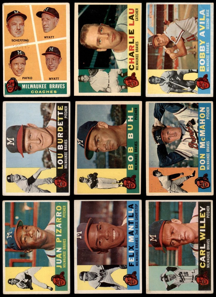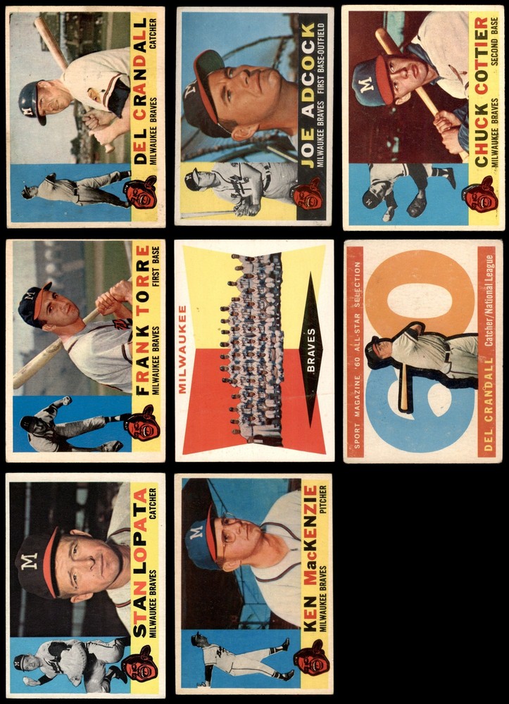 This set contains the following cards 1960 Topps #3 Joe Adcock 2 - GOOD Front Back 1960 Topps #19 Felix Mantilla 3 - VG Front Back 1960 Topps #37 Bill Bruton 2 - GOOD Front Back 1960 Topps #59 Juan Pizarro 2 - GOOD Front Back 1960 Topps #70 Lew Burdette 2 - GOOD Front Back 1960 Topps #90 Bobby Avila 2 - GOOD Front Back 1960 Topps #107 Carlton Willey 2 - GOOD Front Back 1960 Topps #129 - Bob Hartman Rookie Star 2 - GOOD Front Back 1960 Topps #143 - Al Spangler Rookie Star 1 - POOR Front Back 1960 Topps #158 Wes Covington 1.5 - FAIR Front Back 1960 Topps #170 Del Crandall 3 - VG Front Back 1960 Topps #189 Don McMahon 2 - GOOD Front Back 1960 Topps #205 Johnny Logan 1.5 - FAIR Front Back 1960 Topps #213 Chuck Dressen 2 - GOOD Front Back 1960 Topps #230 - Lew Burdette / Warren Spahn / Bob Buhl Mound Magicians 2 - GOOD Front Back 1960 Topps #246 Lee Maye 2 - GOOD Front Back 1960 Topps #266 Joey Jay 1.5 - FAIR Front Back 1960 Topps #281 Ray Boone 1.5 - FAIR Front Back 1960 Topps #300 Hank Aaron 2 - GOOD Front Back 1960 Topps #312 Charlie Lau 1.5 - FAIR Front Back 1960 Topps #335 Red Schoendienst 2 - GOOD Front Back 1960 Topps #351 Don Nottebart 1.5 - FAIR Front Back 1960 Topps #374 Bob Buhl 2 - GOOD Front Back 1960 Topps #381 Braves Team Checklist 2 - GOOD Front Back 1960 Topps #404 Bob Rush 1.5 - FAIR Front Back 1960 Topps #417 Chuck Cottier 3.5 - VG+ Front Back 1960 Topps #420 Eddie Mathews 2 - GOOD Front Back 1960 Topps #445 Warren Spahn 2 - GOOD Front Back 1960 Topps #464 - Bob Scheffing / Whitlow Wyatt / Andy Pafko / George Myatt Braves Coaches 1.5 - FAIR Front Back 1960 Topps #478 Frank Torre 3 - VG Front Back 1960 Topps #491 Mel Roach 1.5 - FAIR Front Back 1960 Topps #515 Stan Lopata 5 - EX Front Back 1960 Topps #534 Ken MacKenzie 1.5 - FAIR Front Back 1960 Topps #558 - Eddie Mathews All-Star 3 - VG Front Back 1960 Topps #566 - Hank Aaron All-Star PSA 3 - VG Front Back 1960 Topps #568 - Del Crandall All-Star 1.5 - FAIR Front Back This is a 1960 Topps Milwaukee Braves Team Set. Set breakdown by grade: Number of Cards in Set 36 Average Grade - Weighted by Value 2.50 - GD+ Average Grade - Unweighted 2.08 - GOOD Grade Breakdown 5 - EX 1 3.5 - VG+ 1 3 - VG 4 PSA 3 - VG 1 2 - GOOD 17 1.5 - FAIR 11 1 - POOR 1 Dean's Cards offers a 100% Money Back Satisfaction Guarantee on all purchases. Just contact us within 10 days of the purchase date and we will refund your money or, when possible, replace the cards. 1960 Topps Milwaukee Braves Team Set 2.5 - GD+ 6908997 If the scan in the listing says ACTUAL IMAGE, you will receive the card pictured. For cards issued after 1983, we will often use representative images and you will not receive the exact card pictured. Shipping Policy You only pay shipping on the first item. If you order multiple items on the same order, you will only be charged once for shipping. We do not combine shipping on multiple orders. To avoid multiple shipping charges we recommend using eBay's "Add to Cart" feature to check out multiple items in one transaction, or please request and allow for us to send an invoice to reflect the combined shipping charges. Canadian customers - We send all of our Canadian/International packages with tracking and cannot make any exceptions to this policy. Negotiating Prices All prices are final and we do not negotiate. This policy is to ensure that everyone knows that they are getting our best possible price. So please do not ask us to negotiate on price. Return Policy Dean's Cards has a 100% Money Back Satisfaction Guarantee on all purchases, as long as the product is returned within 30 days of receiving the product. Card Grading Each card is first reviewed by a member of our team, in order to detect any flaws that may not be visible on a scan, such as wrinkles, creases, print spots, or light stains. The vast majority of our vintage cards are professionally graded by the Dean's Cards Grading Software and include a 100% satisfaction guarantee. Our grading is on par with PSA standards when it comes to corners, centering and flaws - and tends to grade a bit tougher than PSA, on cards with a tilted image or rough edges. This grading software was developed to provide far better grading and consistency than can be achieved using the human eye. Determining the card's grade The sharpness of the corners and the degree to which a card was cut off-center determines the maximum possible grade that the card can receive. The card's grade is further reduced by any flaws or blemishes that it may have. Each card is evaluated on the following characteristics and assigned a score. Corners - Each corner of a card is individually analyzed, and then assigned a score on how square, sharp, and flawless it appears. Centering - The borders are measured, at multiple points along the edge, to determine the horizontal and vertical centering and tilt. Defects - The card is examined for imperfections, such as: size, print flaws, dings, stains, creases, or other wear which could lower its grade. Bonus for Perfect Centering - A vintage card, with near perfect centering, is given a one-half grade bonus. So when you buy one of our cards with a half-grade (e.g. 3.5 or 6.5) it will appear perfectly centered, both vertically and horizontally. Grading Criteria Worst Corner - A card can grade only as high as the worst corner will allow. Average Corner Tilt - The difference in width of a card border near the top, compared to the bottom. OCT - The sum of how far a card is Off-Center, plus its Tilt. Minimum Centering Requirements Eye Appeal - The combination of a card's centering, corners and tilt. Well-Centered - Cards that appear perfectly centered receive a bonus of one-half grade. Flaws, defects and other imperfections - can lower a card's grade. Card Backs - the above criteria is also considered, for the back of the cards, but does not inflict as severe of a penalty to its grade. Packaging Once scanned, the cards are placed in "soft" sleeves, which have an open top for easy removal. Th