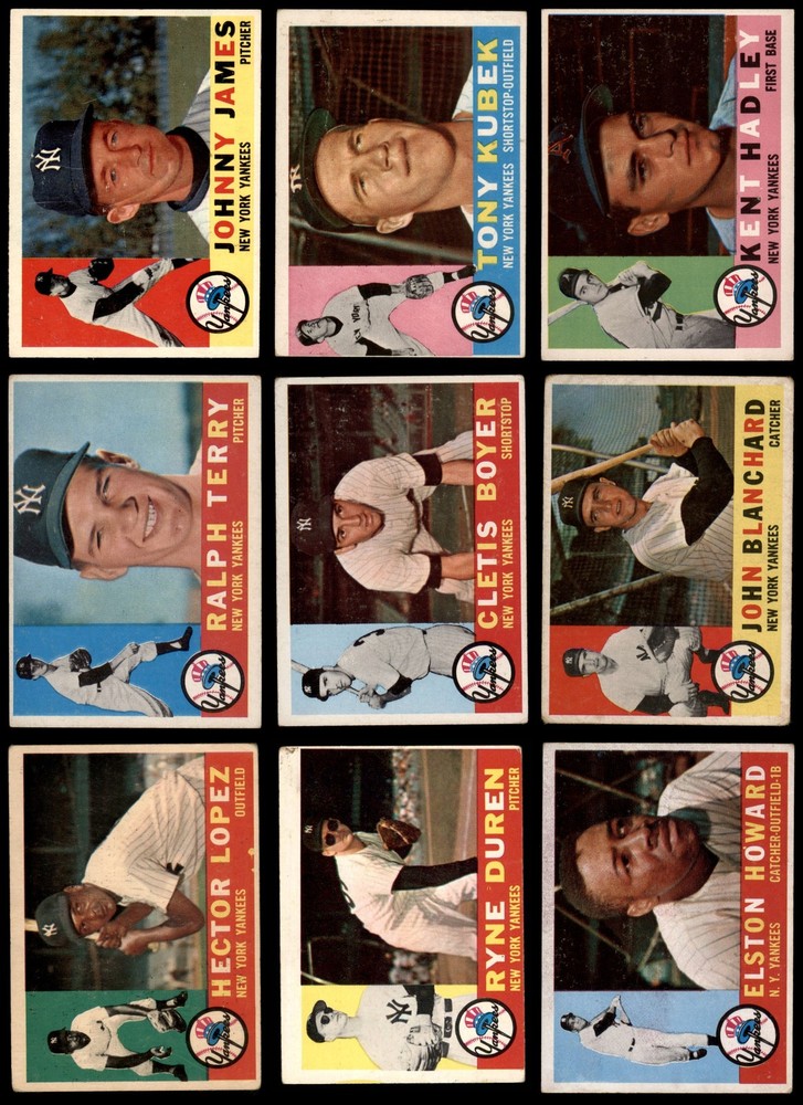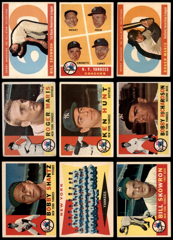 This set contains the following cards 1960 Topps #35 Whitey Ford 3.5 - VG+ Front Back 1960 Topps #51 Jim Coates 1.5 - FAIR Front Back 1960 Topps #65 Elston Howard 2 - GOOD Front Back 1960 Topps #83 Tony Kubek 3 - VG Front Back 1960 Topps #96 Ralph Terry 2 - GOOD Front Back 1960 Topps #102 Kent Hadley 3 - VG Front Back 1960 Topps #109 Clete Boyer 2 - GOOD Front Back 1960 Topps #134 - Deron Johnson Rookie Star 2 - GOOD Front Back 1960 Topps #142 - Bill Short Rookie Star 2 - GOOD Front Back 1960 Topps #160 - Mickey Mantle / Ken Boyer Rival All-Stars 2 - GOOD Front Back 1960 Topps #163 Hector Lopez 1.5 - FAIR Front Back 1960 Topps #183 Eli Grba 1.5 - FAIR Front Back 1960 Topps #196 Andy Carey 1.5 - FAIR Front Back 1960 Topps #204 Ryne Duren 2 - GOOD Front Back 1960 Topps #227 Casey Stengel 1.5 - FAIR Front Back 1960 Topps #237 Elmer Valo 2 - GOOD Front Back 1960 Topps #247 Gil McDougald 1.5 - FAIR Front Back 1960 Topps #270 Bob Turley 1.5 - FAIR Front Back 1960 Topps #283 John Blanchard 2 - GOOD Front Back 1960 Topps #315 Bobby Shantz 2 - GOOD Front Back 1960 Topps #329 Zack Monroe 2 - GOOD Front Back 1960 Topps #332 Yankees Team Checklist 2 - GOOD Front Back 1960 Topps #350 Mickey Mantle 2 - GOOD Front Back 1960 Topps #358 Joe DeMaestri 2 - GOOD Front Back 1960 Topps #370 Bill Skowron 2 - GOOD Front Back 1960 Topps #377 Roger Maris 2 - GOOD Front Back 1960 Topps #405 Bobby Richardson 2 - GOOD Front Back 1960 Topps #421 Duke Maas 1 - POOR Front Back 1960 Topps #430 Art Ditmar 1.5 - FAIR Front Back 1960 Topps #465 - Bill Dickey / Ralph Houk / Frank Crosetti / Ed Lopat Yankees Coaches 3 - VG Front Back 1960 Topps #480 Yogi Berra 2 - GOOD Front Back 1960 Topps #499 Johnny James 5 - EX Front Back 1960 Topps #522 Ken Hunt 3.5 - VG+ Front Back 1960 Topps #553 - Bill Skowron All-Star 3 - VG Front Back 1960 Topps #563 - Mickey Mantle All-Star 4 - VG/EX Front Back 1960 Topps #565 - Roger Maris All-Star 1.5 - FAIR Front Back This is a 1960 Topps New York Yankees Team Set. The Yankees returned to the World Series in 1960, but lost to the Pirates in 7 games. The #160 - Mickey Mantle / Ken Boyer Rival All-Stars, #350 Mickey Mantle, #563 - Mickey Mantle All-Star, and #565 - Roger Maris All-Star cards were removed in an effort to keep this team set affordable. ?They can all be purchased separately. Set breakdown by grade: Number of Cards in Set 36 Average Grade - Weighted by Value 2.74 - GD+ Average Grade - Unweighted 2.18 - GOOD Grade Breakdown 5 - EX 1 4 - VG/EX 1 3.5 - VG+ 2 3 - VG 4 2 - GOOD 18 1.5 - FAIR 9 1 - POOR 1 Dean's Cards offers a 100% Money Back Satisfaction Guarantee on all purchases. Just contact us within 10 days of the purchase date and we will refund your money or, when possible, replace the cards. 1960 Topps New York Yankees Team Set Won A.L. Pennant 2.5 - GD+ 6910078 If the scan in the listing says ACTUAL IMAGE, you will receive the card pictured. For cards issued after 1983, we will often use representative images and you will not receive the exact card pictured. Shipping Policy You only pay shipping on the first item. If you order multiple items on the same order, you will only be charged once for shipping. We do not combine shipping on multiple orders. To avoid multiple shipping charges we recommend using eBay's "Add to Cart" feature to check out multiple items in one transaction, or please request and allow for us to send an invoice to reflect the combined shipping charges. Canadian customers - We send all of our Canadian/International packages with tracking and cannot make any exceptions to this policy. Negotiating Prices All prices are final and we do not negotiate. This policy is to ensure that everyone knows that they are getting our best possible price. So please do not ask us to negotiate on price. Return Policy Dean's Cards has a 100% Money Back Satisfaction Guarantee on all purchases, as long as the product is returned within 30 days of receiving the product. Card Grading Each card is first reviewed by a member of our team, in order to detect any flaws that may not be visible on a scan, such as wrinkles, creases, print spots, or light stains. The vast majority of our vintage cards are professionally graded by the Dean's Cards Grading Software and include a 100% satisfaction guarantee. Our grading is on par with PSA standards when it comes to corners, centering and flaws - and tends to grade a bit tougher than PSA, on cards with a tilted image or rough edges. This grading software was developed to provide far better grading and consistency than can be achieved using the human eye. Determining the card's grade The sharpness of the corners and the degree to which a card was cut off-center determines the maximum possible grade that the card can receive. The card's grade is further reduced by any flaws or blemishes that it may have. Each card is evaluated on the following characteristics and assigned a score. Corners - Each corner of a card is individually analyzed, and then assigned a score on how square, sharp, and flawless it appears. Centering - The borders are measured, at multiple points along the edge, to determine the horizontal and vertical centering and tilt. Defects - The card is examined for imperfections, such as: size, print flaws, dings, stains, creases, or other wear which could lower its grade. Bonus for Perfect Centering - A vintage card, with near perfect centering, is given a one-half grade bonus. So when you buy one of our cards with a half-grade (e.g. 3.5 or 6.5) it will appear perfectly centered, both vertically and horizontally. Grading Criteria Worst Corner - A card can grade only as high as the worst corner will allow. Average Corner Tilt - The difference in width of a card border near the top, compared to the bottom. OCT - The sum of how far a card is Off-Center, plus its Tilt. Minimum Centering Requirements Eye Appeal - The combination of a card's centering, corners and tilt. Well-Centered - Cards that appear perfectly centered receive a bonus of one-