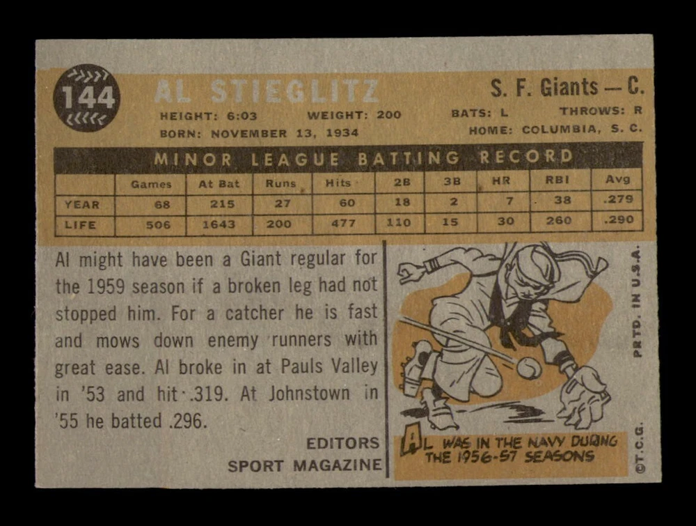 Player: Al Stieglitz Year: 1960 Sport: Baseball Original/Reprint: Original Graded: No Card Manufacturer: Topps Season: 1960 Series: Varies