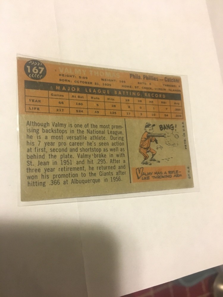 Capture a slice of baseball history with this 1960 Topps #167 card featuring Valmy Thomas of the Philadelphia Phillies. A treasured find for collectors, this vintage card is a tangible connection to the golden era of the sport, offering a glimpse into the past through the classic Topps design and the unmistakable feel of a piece from the 1960s. Certified by PSA as a 6 EX-MT, the card stands as a testament to the quality and care it has received over the years. Whether you're a fan of the player, a devotee of the Phillies, or a connoisseur of Major League Baseball memorabilia, this card is a noteworthy addition to any collection.