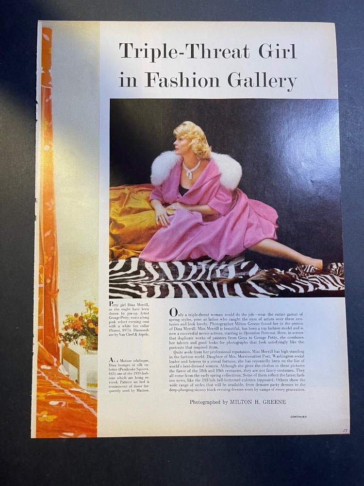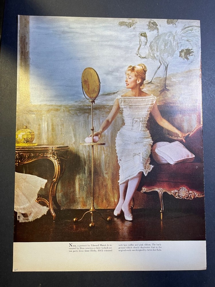 1. This vintage 1960 Diana Merrill fashion model article is a stunning piece for collectors! The five-page spread includes six beautiful illustrations, each roughly 10.5x14 inches, perfect for framing. Though it shows slight age toning and minor corner wear, the overall condition is excellent—great for adding retro charm to any collection. Ships securely in a sturdy mailer for safe delivery. A fantastic find for fashion and history enthusiasts alike!