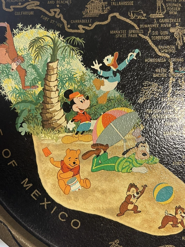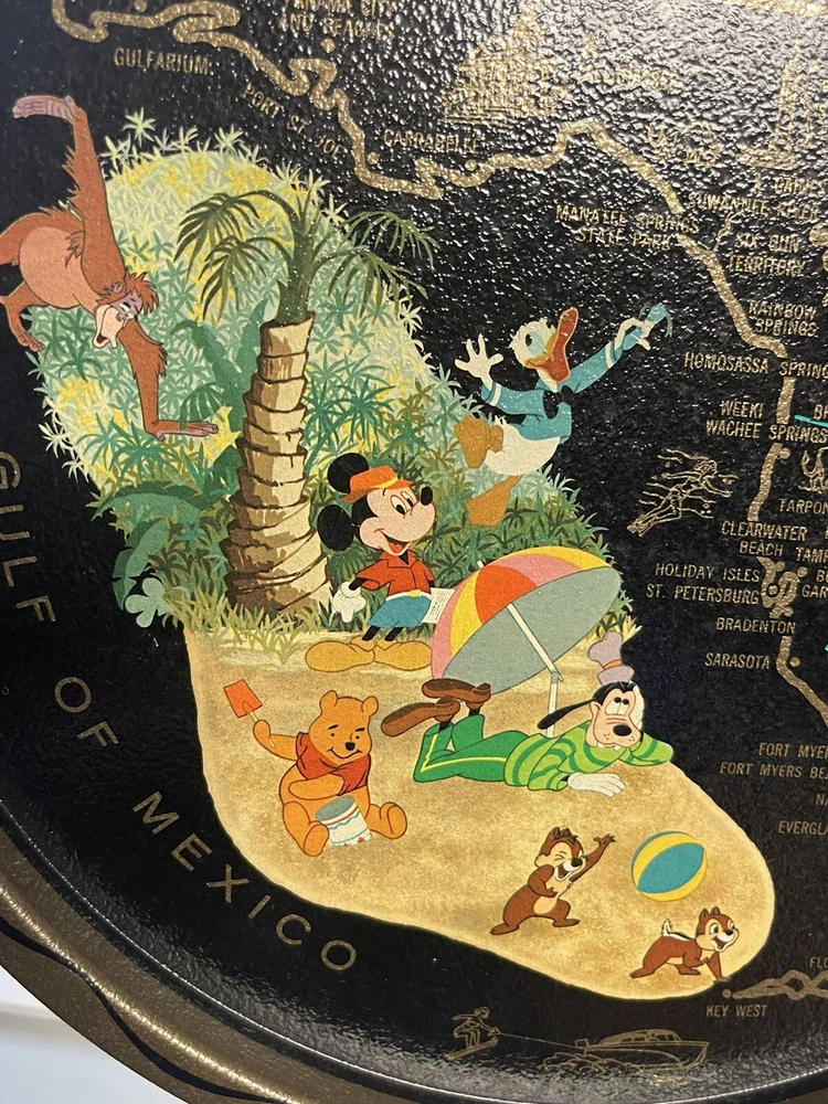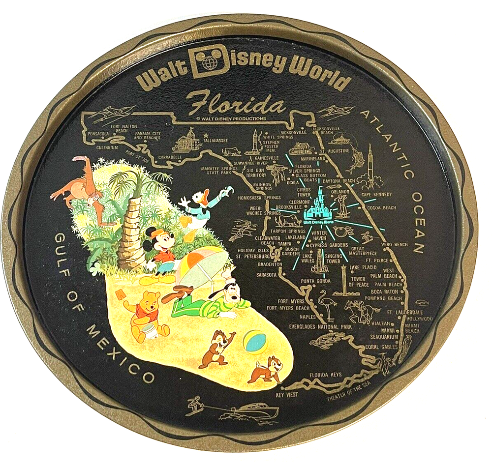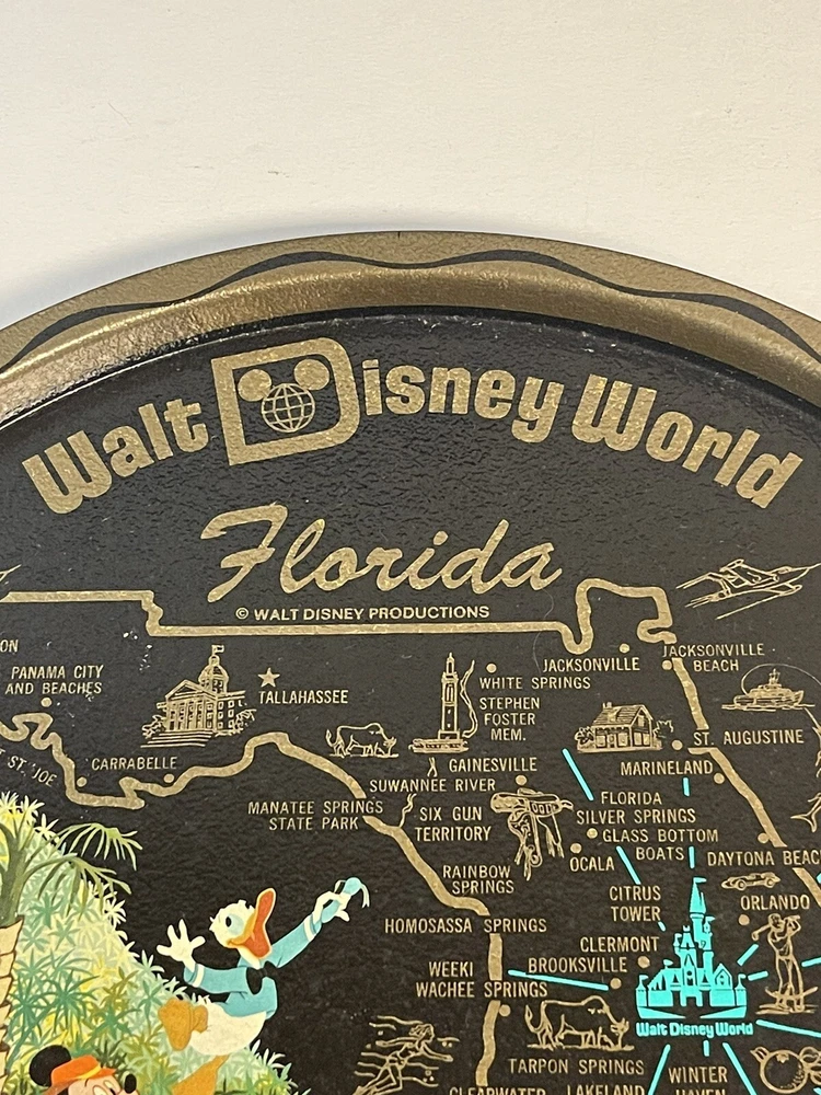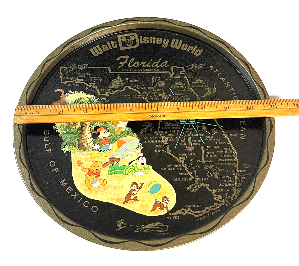 This vintage Walt Disney World serving tray features a colorful map of Florida with Mickey Mouse at the center. The tin tray is from the 1960s and is a perfect addition to any Disneyana or theme park souvenir collection. The tray is in great shape and has no signs of wear and tear. It is a great way to showcase your love for Disney and add a touch of nostalgia to your home decor.11" wide. T hank you for looking. This item is from a smoke free home. Please view all the photos. Check out all my other items. We ship in the US only.