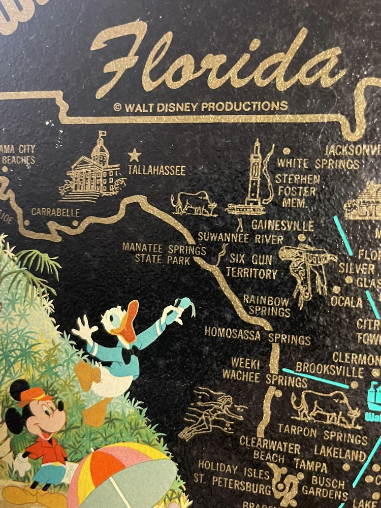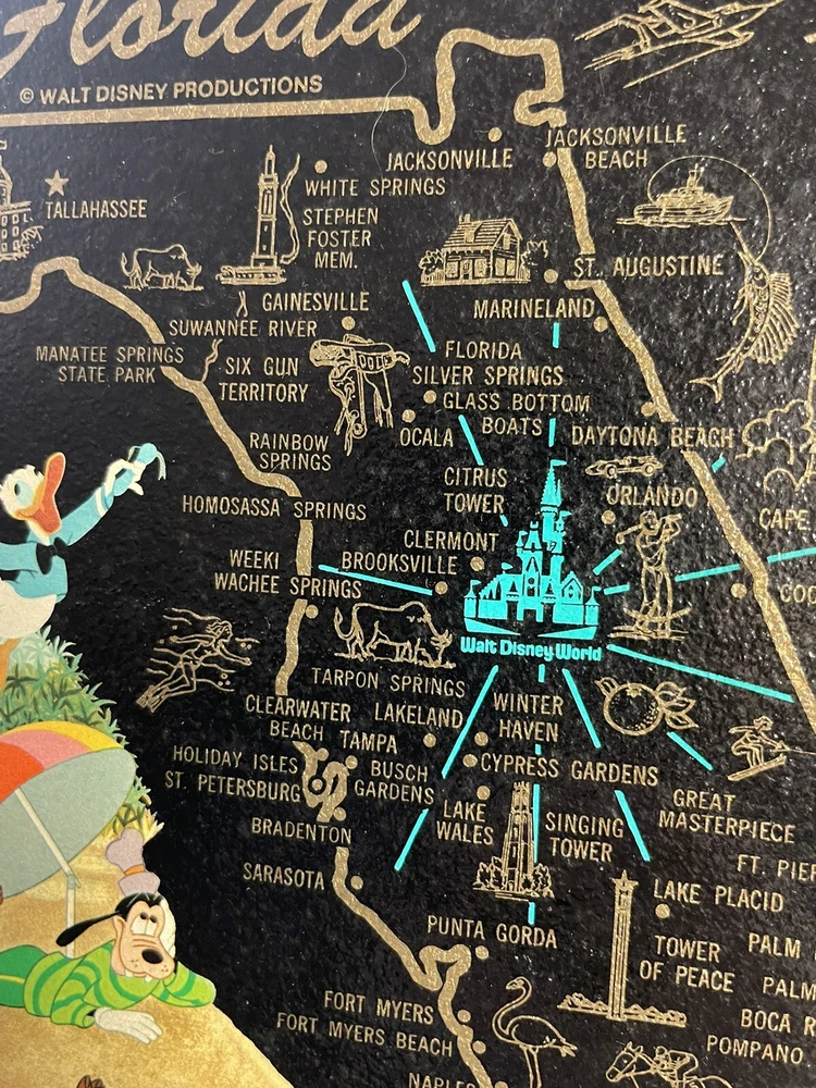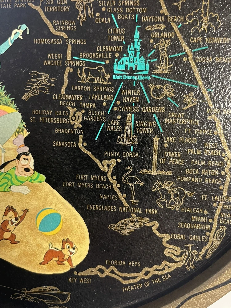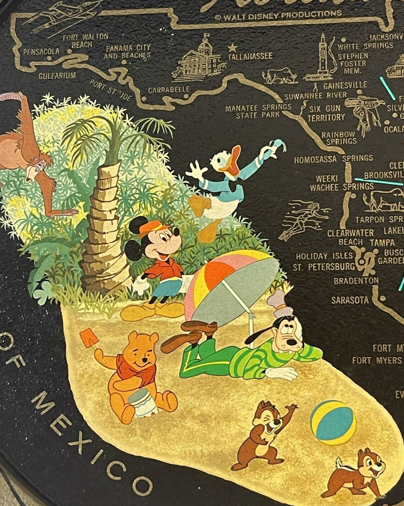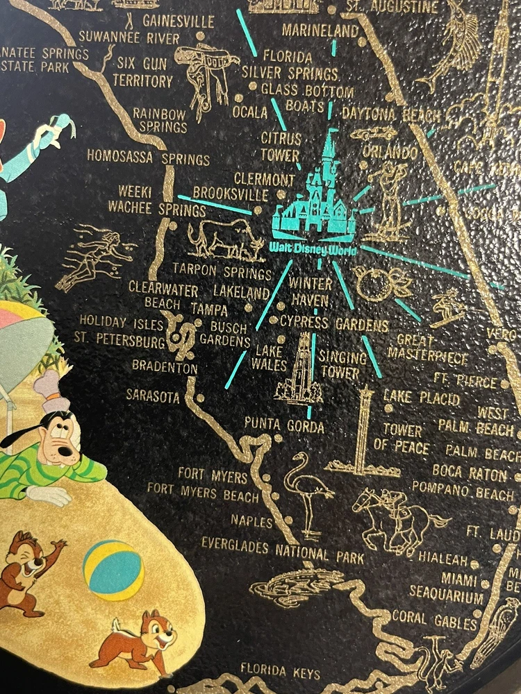 This vintage Walt Disney World serving tray features a colorful map of Florida with Mickey Mouse at the center. The tin tray is from the 1960s and is a perfect addition to any Disneyana or theme park souvenir collection. The tray is in great shape and has no signs of wear and tear. It is a great way to showcase your love for Disney and add a touch of nostalgia to your home decor.11" wide. T hank you for looking. This item is from a smoke free home. Please view all the photos. Check out all my other items. We ship in the US only.