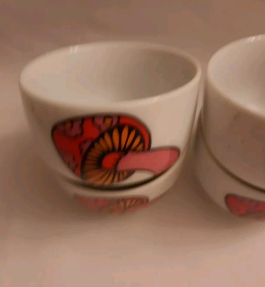 Add some retro charm to your dining table with this set of four vintage serving bowls. The porcelain bowls feature a colorful orange and white mushroom design, perfect for a mid-century modern themed dinner party. Each bowl is round in shape and 2.25 in height making them ideal for serving. The set includes four bowls and is manufactured in 1960 using the pottery production technique. The brand is Serving Bowls Mushroom and the style is art pottery. Perfect for collectors or those who appreciate unique and vintage pieces.