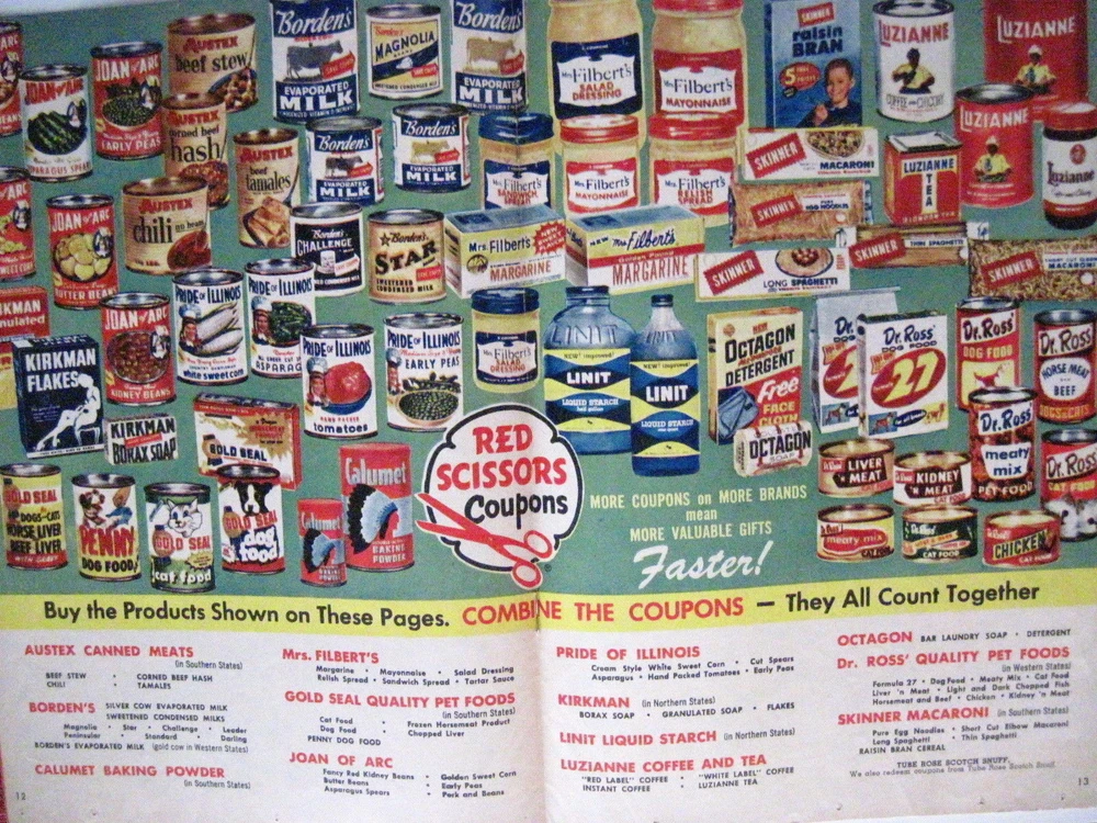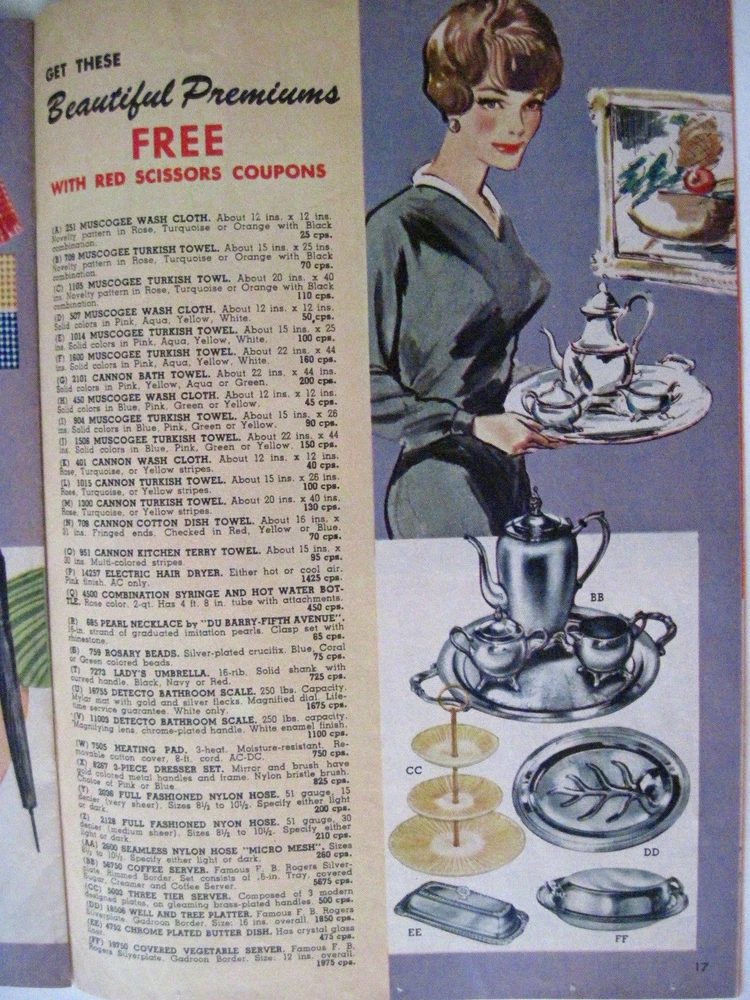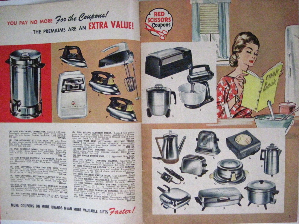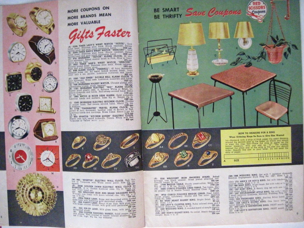 Description: This 1961 "Red Scissors Coupon Book" has Great Colored Period Pictures. History - " Trading stamps are small paper coupons given to customers by merchants in loyalty marketing programs that predate the modern loyalty card . Like the similarly-issued retailer coupons, these stamps only had a minimal cash value of a few mils (hundredths of a cent) individually, but when a customer accumulated a number of them, they could be exchanged with the trading stamp company (usually a third-party issuer of the stamps) for premiums , such as toys, personal items, house wares, furniture and appliances. The practice started in the 1890s, at first given only to customers who paid for purchases in cash , to reward those who did not purchase on credit . The bottom fell out of the trading stamp business in 1965, when many supermarkets stopped issuing stamps altogether and started spending more money to advertise lower prices. [5] Their role has been subsumed by rewards programs offered by credit card companies and other loyalty programs , such as grocery "Preferred Customer" cards." Measures - 7" W x 10" H. Condition: Corners and edges are slightly worn. In good condition. Free shipping in the U.S. Items are shipped out every Monday morning. Like what you see? Check out my other items ! 02/2015 Nancy