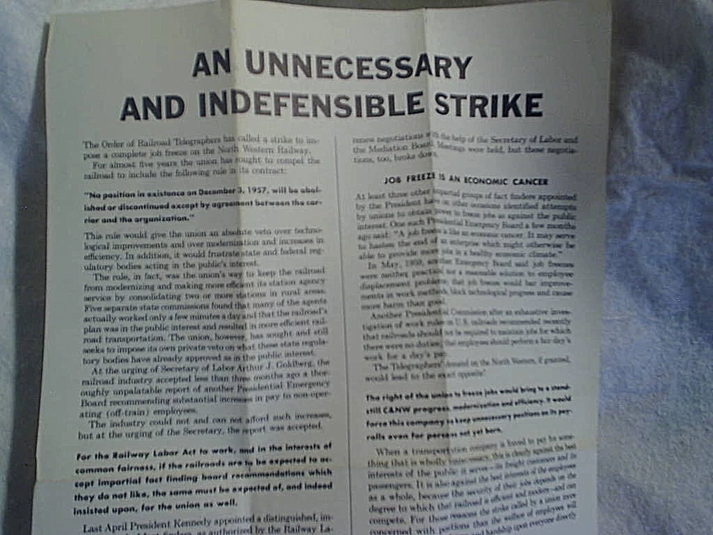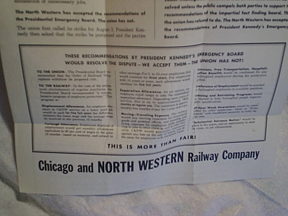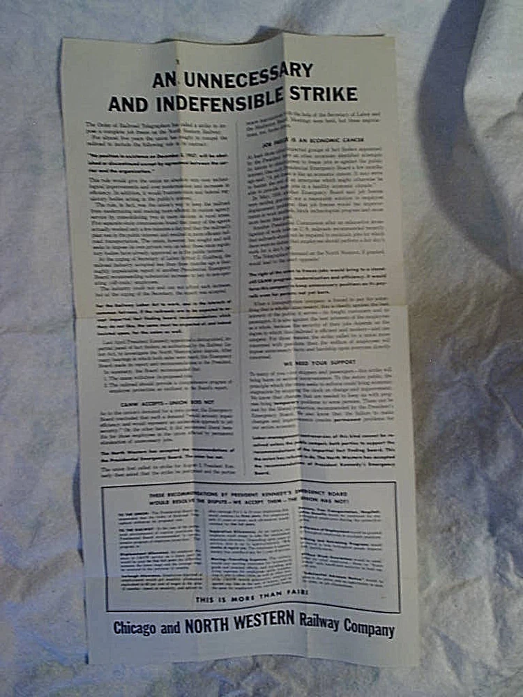 VINTAGE STRIKE FLYER FROM 1962. 1 SHEET. *MENTIONS PRESIDENT KENNEDY'S EMERGENCY BOARD. CONDITION-HAS FOLDS TANNING/YELLOWING, AND A LITTLE BUG HOLE NEAR THE TOP EDGE. SIZE-11 1/4" x 20 5/8". *****SHIPPED FOLDED IN A BOX. smoke free. *****paypal accepted. *****I COMBINE SHIPPING. IF YOU PURCHASE MORE THAN 1 ITEM. PLEASE WAIT FOR A REVISED INVOICE BEFORE PAYING. be sure to check out my ebay store. thanks for looking.