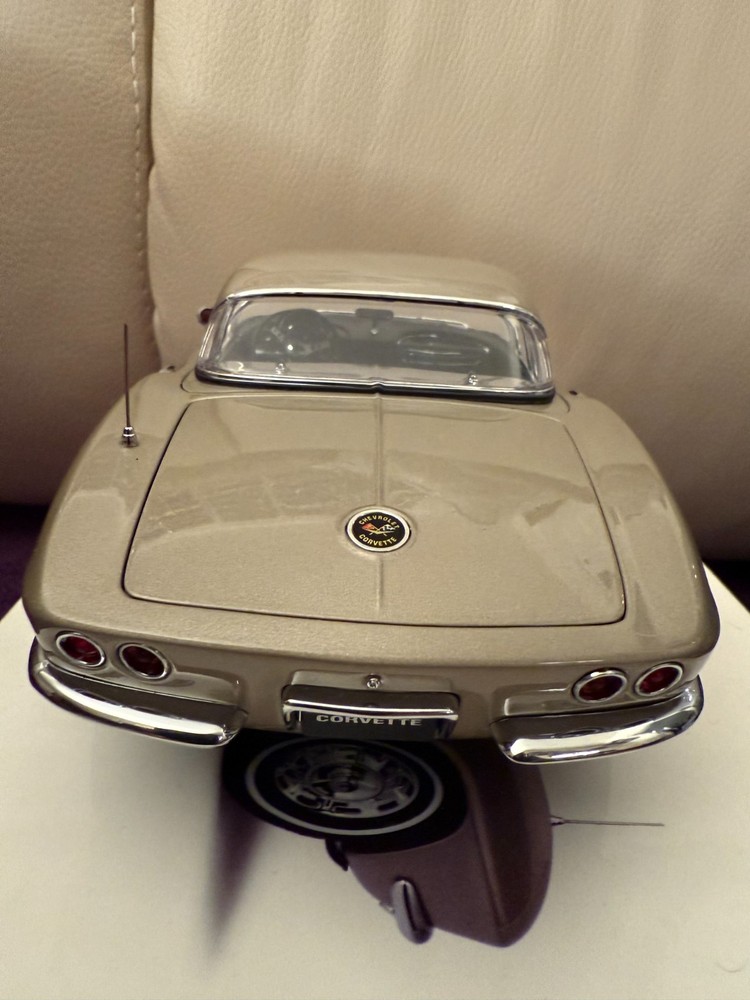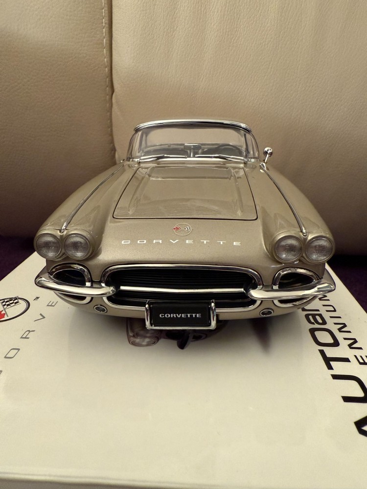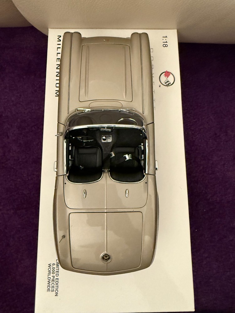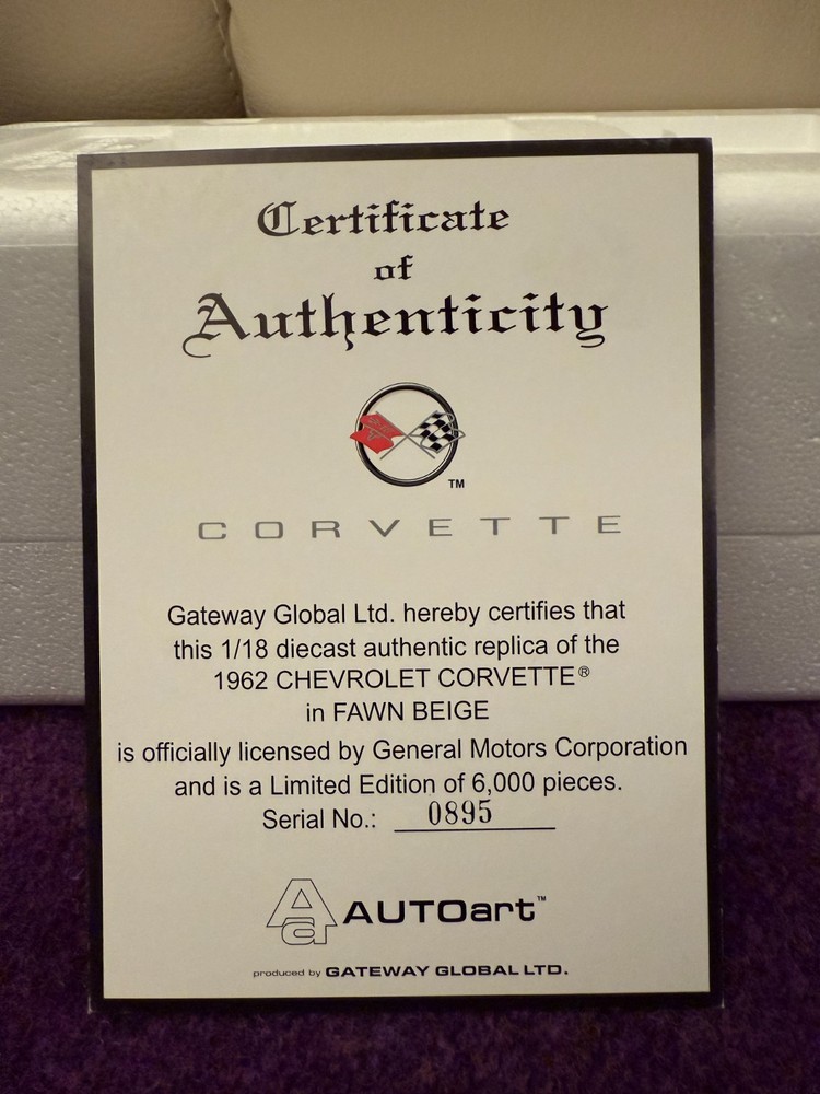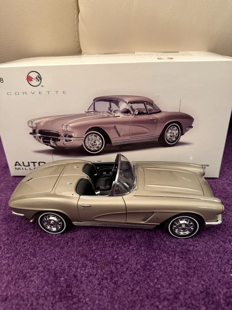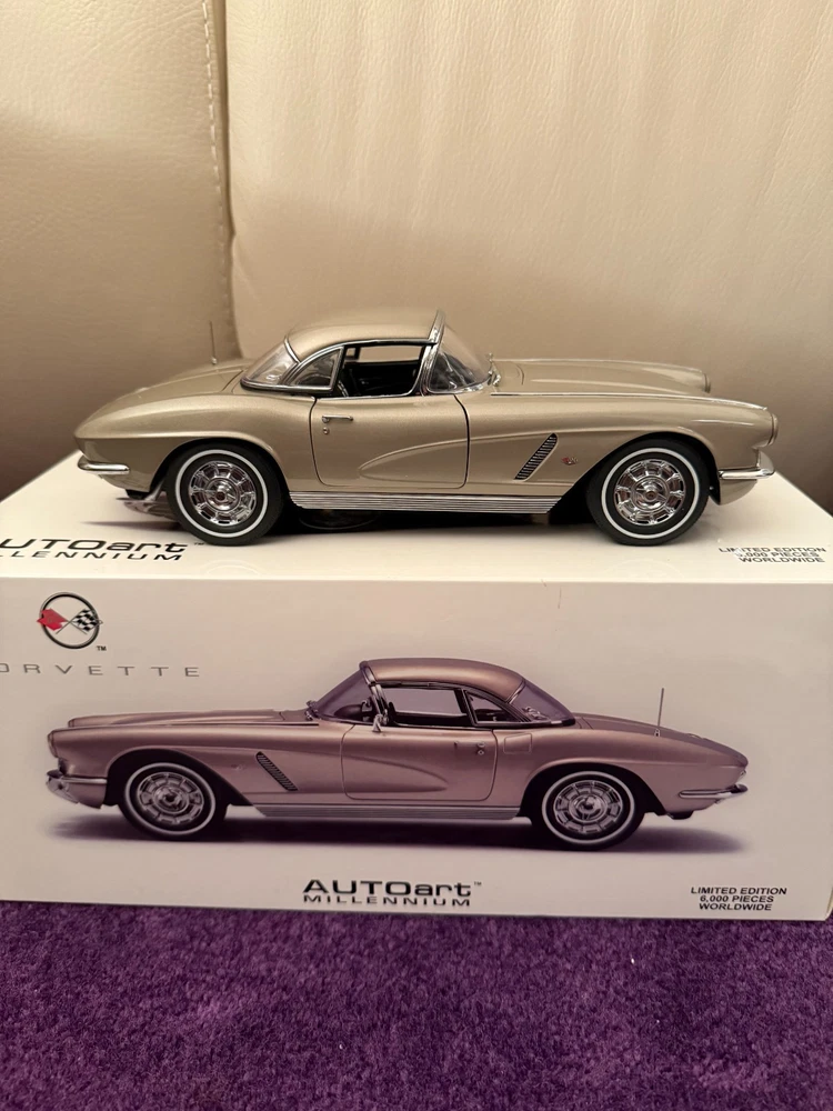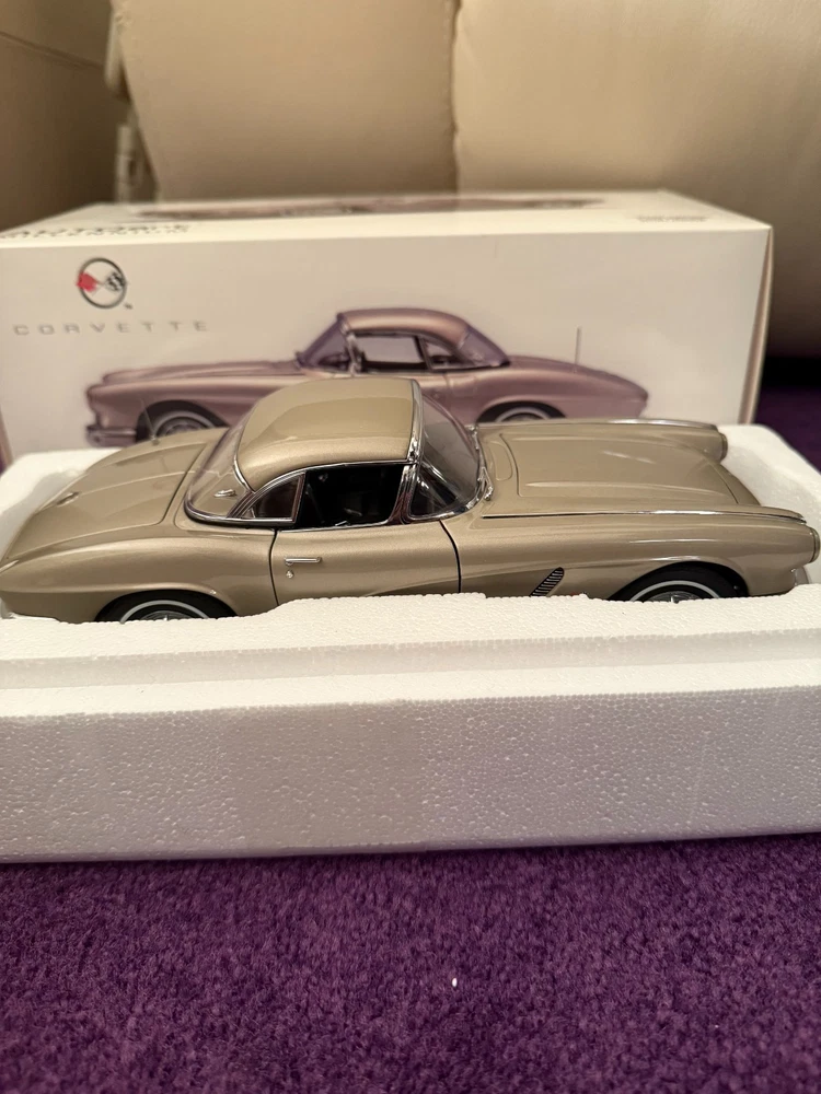 AUTOart 1962 Chevrolet Corvette – Fawn Beige – (Millennium) 1:18 – Rare Color – From Private Collection From my father’s meticulous collection. Offered here is the 1962 Chevrolet Corvette by AUTOart in the striking and hard-to-find Fawn Beige finish, arguably the most elegant color on the final-year C1. This is a display-only piece from a smoke- and pet-free home and presents beautifully. Why This Model Stands Out AUTOart precision (Millennium series) with crisp panel gaps and fine chromework Highly accurate ’62 C1 details : smooth “toothless” grille, ducktail rear deck, crossed-flags scripts, and period wheel covers Opening hood, doors, and trunk with realistic hinges Detailed 327 V8 engine bay, wiring, and hoses Fully appointed cockpit: textured dash, gauges, shifter, seat belts, and carpeted floors Steerable front wheels & rubber tires Factory-correct Fawn Beige paint with deep, glassy sheen— a rare AUTOart colorway Condition Model: Near-mint from enclosed display—no cracks, repairs, or missing trim observed. Paint and chrome are bright and uniform. Packaging/stand: If original packaging or base is included it will be shown in photos; what you see is exactly what you will receive. Photos are of the exact car —please zoom for details. Shipping & Handling Professionally packed: protected body, immobilized doors/hood, double-boxed. Ships with tracking.