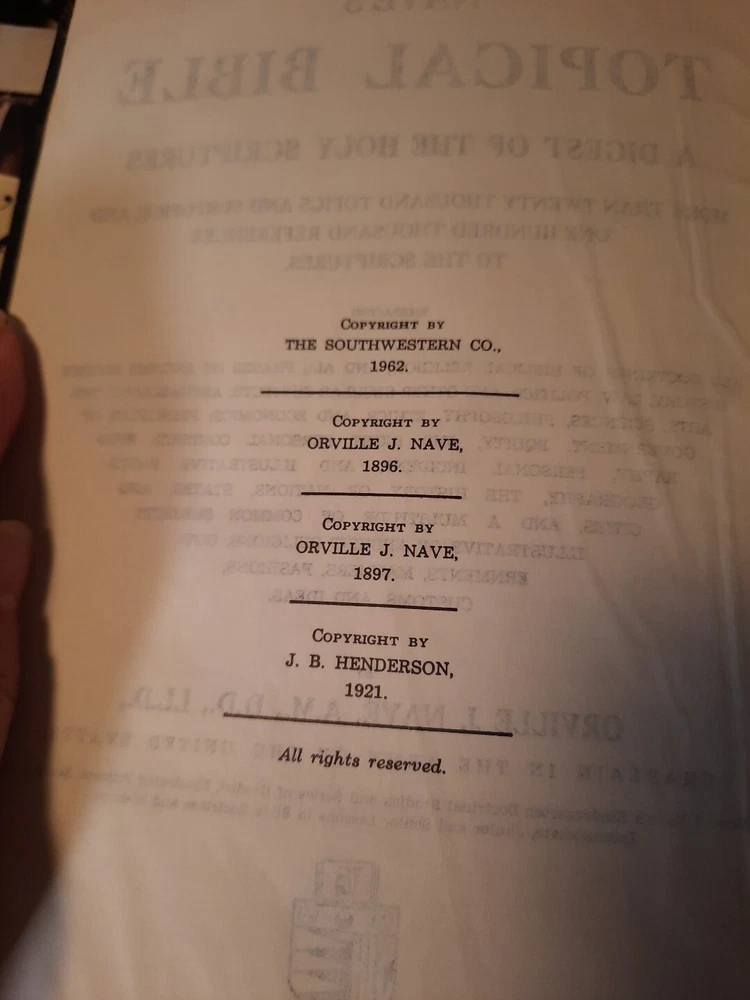 This is a thumb-indexed copy of Nave's Topical Bible, a nonfiction book that provides a digest of the Holy Scriptures. Published in 1962 by Southwestern, this book is in English and has a flex cover format. It is a great resource for those interested in religious and spiritual topics, particularly Bible study. The book is authored by Orville J. Nave and is a valuable addition to any collection of religious literature. This item was made in the United States and is categorized under Books & Magazines and Books.