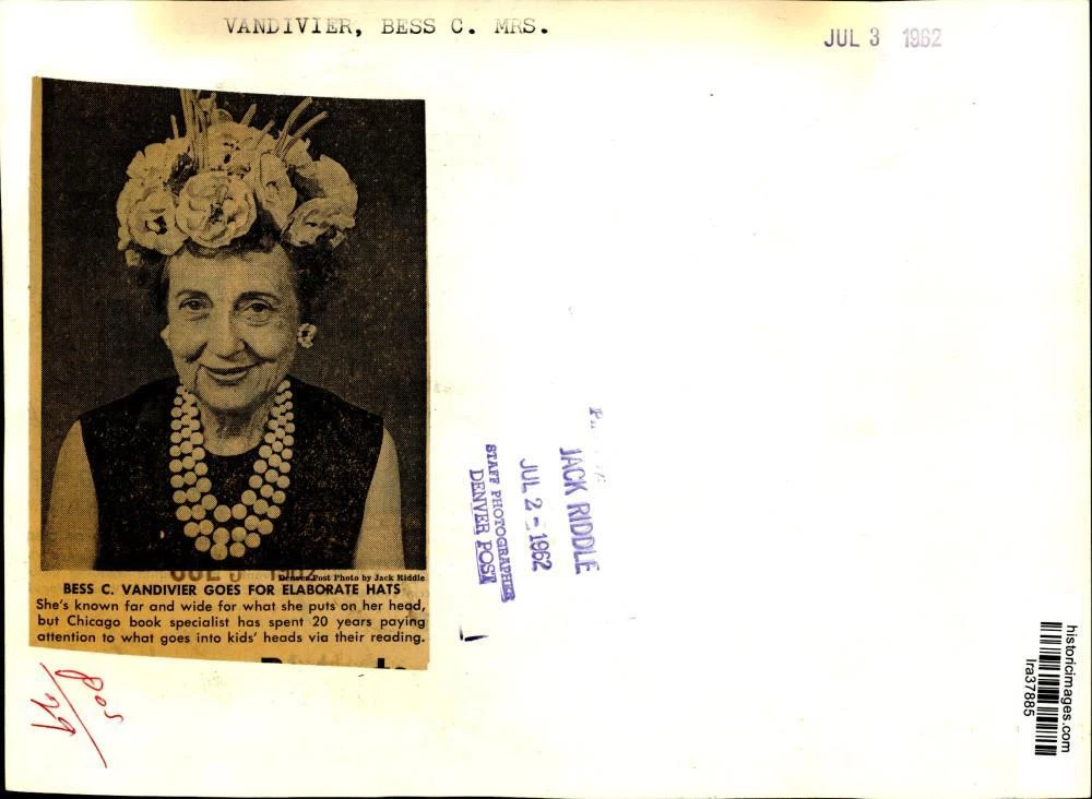 ebay template Note: Please study the images carefully to determine the condition of this vintage photograph, as it may not be in perfect condition. It may contain wrinkles, cracks, and possibly even tears due to its age and how it was handled before it got to us. A scanner may interpret colors and contrast differently than human eyes will, so it is possible that the actual photograph may be slightly darker or lighter in person. This vintage photograph is offered for sale as a collectible item and conveys no transfer of copyright. 1962 Press Photo Chicago book specialist Bess Vandivier wearing an elaborate hat This is an original press photo. Bess C. Vandivier goes for elaborate hats...She's known far and wide for what she puts on her head, but Chicago book specialist has spent 20 years paying attention to what goes into kids' heads via their reading.Photo measures 7 x 9.5inches. Photo is dated 7-2-1962. PHOTO FRONT PHOTO BACK Historic Images Part Number: lra37885 FAQs Q: Can I just download a digital version instead? A: No, we sell only vintage originals and do not make or distribute any copies, including digital ones. Q: Do you combine shipping and invoices? A: Multiple photos won on the same seller ID combine automatically through the eBay checkout process. If you encounter problems with this, send us a message via eBay messaging and we will send you an invoice. Due to eBay limitations, we cannot combine items won on our different seller IDs for a single shipping charge. Q: How quickly do you ship the items once paid? A: We ship within one business day after your payment clears. If you do not receive an "order shipped" email from us by the close of the second business day from submitting payment, please e-mail us via eBay messaging. Q: How do you make sure my photograph arrives safely? A: We package each order between two cross-corrugated pieces of cardboard to ensure that the package is as difficult to bend as possible. We then wrap each order in a plastic sheet to help protect against moisture. We want you to rest assured that we take every precaution to ensure that the photograph you receive will be in the same condition in your care as it was in ours. Q: Will the "Historic Images" watermark be on my photo when I receive it? A: No. This is a digital watermark we use to protect our images. It is not printed on the photo. Q: What are your office hours? A: eBay for us is a business, and a very fun one to be in! We are open M-F 9 to 5 (CST). Therefore, we do not return e-mails and phone calls over the weekend. We observe the following holidays: New Years Day, Memorial Day, Fourth of July, Labor Day, Thanksgiving and the day after Thanksgiving, Christmas Eve and Christmas Day. Q: Where did all these vintage photos come from? A: These original vintage photographs are from various news service and newspaper photo archives from locations around the country including: Boston, Detroit, Tampa, Chicago, Denver, Seattle, New Orleans, Milwaukee, Portland, Spokane, and more. We do not copy or reproduce any photographs -- every item is a unique vintage piece that was housed in a news archive. Q: Can I use this photograph in my book/blog/website? A: The short answer is no. There is no transfer of copyright for republication or reproduction with these photographs when you purchase them, and only photographs taken before 1923 are currently automatically in the public domain. Permission from the copyright holder, which usually can be identified from the back of each photo, must be sought to republish or reproduce the image for any purpose. Q: Do you relist items (in case I miss an auction ending)? A: Auction items that receive no bids are relisted in our store (historicimages-store on eBay) as a fixed-price item and at a higher price than the starting auction price. Q: Do you leave feedback? A: Yes, we always leave feedback for buyers. Our software monitors when our buyers leave us feedback, then notifies us that we can leave feedback for the buyer. Rest assured, if you leave feedback, we will do the same! Check out our family of eBay IDs: historicimages01 Sports Photos historicimages02 Entertainment Photos historicimages03 Americana Photos historicimages04 International & War Photos historicimages05 Transportation Photos historicimages06 Photos of All Subjects historicimages07 Entertainment Photos historicimages08 Newsworthy Photos historicimages09 Entertainment Photos historicimages10 Sports Photos historicimages-store Our largest fixed-price selection historicimages-gallery Hand-picked photos Saturday night auctions About Us Historic Images was formed in September 2009, with a handful of scanners working out of a basement to digitize newspaper photo archives. We have since moved out of the basement, and we can now archive thousands of photos per day. Our company has worked with magazines and newspapers from Detroit, Boston, Denver, Seattle, Tampa, Chicago, and New Orleans, just to name a few. We are constantly adding to our inventory, and have assembled an archive of millions of photos to date. As our company evolved, we began our eBay business, which brings thousands of fresh auctions per week to the world's largest online auction marketplace. Our custom software systems and team of great employees allow us to efficiently scan and sell large photo archives online. At the very core of our company's DNA is a strong commitment to customer satisfaction and strict integrity for our product. Our promise to you is that we will do everything in our power to provide you a great buying experience. Copyright 2009 - Present, Historic Images, Inc. Sell Smarter with Kyozou. Inventory and Ecommerce Management