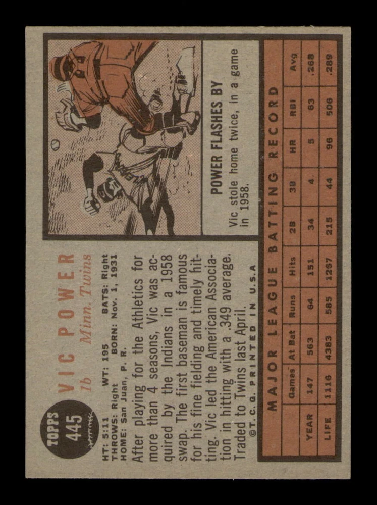 Card Number: 445 Original/Reprint: Original Season: Varies Graded: No Year: 1962 Player: Vic Power Sport: Baseball Card Manufacturer: Topps