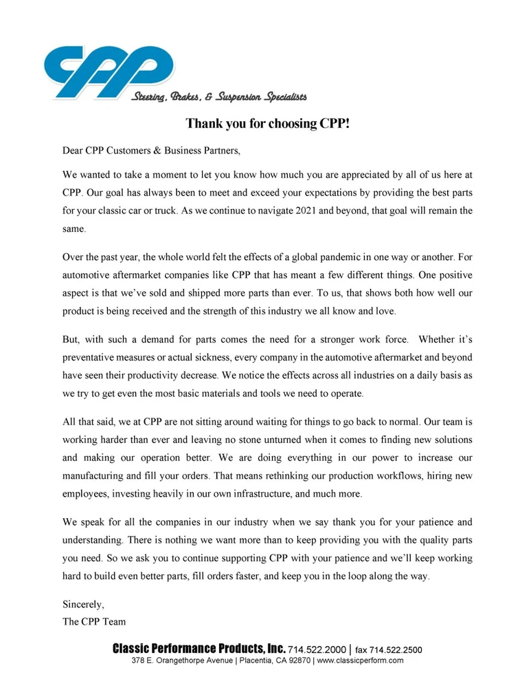 Steering • Brakes • Suspension Call the Experts TOLL FREE: for more information about your eBay purchases 1962-1967 Chevrolet Chevy II / Nova CPP Mini Subframe Tubular A-arm Kit Note: Pictures show silver version, this kit is for the black powder coated version Features: Adjustable forward control arm mounts (eliminates the factory strut rods) Bolt-in installation (some drilling required) Tubular A-arms constructed of 120 Wall DOM tubing Increased stability and improved steering response Over 2" of ground clearance Maintains proper alignment with the use of lockout plates Better ride quality and more positive road feedback Includes new ball joints and premium hardware Will work with factory and aftermarket sway bars up to 1" in diameter Black powder coat finish Made In The USA This is a new 1962-67 Nova tubular control arm kit by Classic Performance Products. It eliminates the factory strut rods and adds adjustable forward control arm mounts. This kit adds stability, improved steering response and over 2" of ground clearance for your early Nova. By eliminating the bind of factory strut rods you are able to maintain proper alignment with the use of lock out plates and gain a freer range of motion in the lower control arms. This results in better ride quality and more positive road feedback. CPP’s kits accommodate both the factory sway bar and aftermarket 1" bars (1-1/8" Sway bars will not fit) . The one-piece crossmember ties both frame rails together by bolting in where the factory strut rod mounts were located, providing additional strength. It also adds only 2 lbs to the car after removing the heavy factory strut rods and bulky strut rod mounts. There is no cutting or welding required. The rear of the lower control arm mounts in the factory location and the original camber adjustments are used. The front of the lower control mounts to the new crossmember and adds a forward caster adjustment to guarantee a perfect, simple and hassle-free alignment. This kit includes 2 one-piece 1-1/4" 120 wall DOM tubular lower control arms, simple bolt-in 1/4" thick steel cross member with forward mounting, 4 alignment cam kits, grade 8 hardware, and CPP's low friction, long life bushings and CPP's new premium lower ball joints. Note: Pictures show silver version, this kit is for the black powder coated version (Part# 6267TCA-KB) BEFORE LEAVING FEEDBACK If you receive an order that does not meet your expectations, please allow us the opportunity to fix the problem before leaving negative feedback or rating us. We want you to be happy with your purchase! Contact us via the Message Center if you require any assistance. SHIPPING INFORMATION Orders over $599 will be sent out with signature required. You will need to sign for all of your packages, or they will be returned to sender, and will require additional shipping charges. Most items (unless noted in the handling time) ship from our warehouse within 4-5 business days from the business day your payment is received and processed in our system. Orders placed Friday and through the weekend will be processed Monday (excluding Holidays). Once your order is processed and shipped from our warehouse you will receive an email with your tracking information. We ship via UPS and FedEx and for small packages we us USPS. We only ship to a confirmed PayPal shipping address. All Will Call orders must be placed at least 24 hours in advance for pickup from the showroom, including in showroom or parking lot orders. Local pickup is available upon request. A matching ID, which must correspond to the name on the PayPal payment, is mandatory for picking up items. Will Call orders will not be released and will be refused if the person and ID do not match the PayPal payment. Local pick up requires a 24hr processing time before pick up. We will notify you when the parts are ready for pick up. CONTACT US Messages via eBay are answered within 24 hours, not including weekends or holidays. Warranty All eBay purchases come with a 30-day warranty from the day you receive your order. If you receive an item that is damaged or defective or missing components, please notify us within 3 days of receipt. Any items outside the 30-day warranty will be the responsibility of the customer to pay for any repairs, as well as cover all shipping costs.