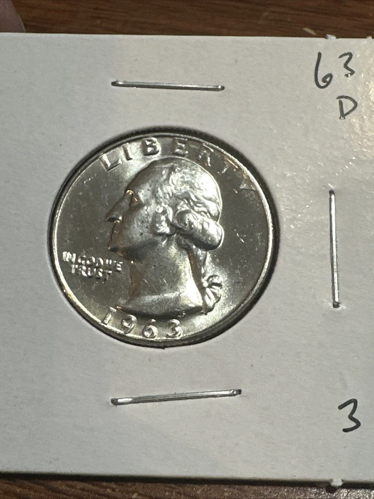 This 1963 D Washington Quarter is a brilliant uncirculated coin that is perfect for any collector. Made of 90% silver, this coin has a denomination of 25C and features a business strike type. The coin was minted in Denver and has not been graded or certified. The obverse side of the coin features the bust of George Washington, while the reverse side showcases the Presidential Seal. This variety of Washington coins is a great addition to any collection and is a must-have for any coin enthusiast. Don't miss out on the opportunity to add this rare and beautiful coin to your collection today. These are business strike coins.