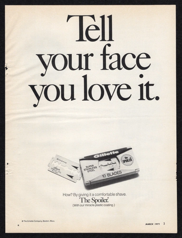 1963 Gillette Super Stainless Steel Love Face Comfortable Shave Spoiler Print Ad Original Advertisement Page Placement: Interior A single page, with both sides scanned and described. Suitable for Framing M any older magazine text/images were printed mis align ed with the edges. Even within the page, text and images can be misaligned with each other. Trimming all four edges doesn’t always fix the issue, and leaves less room to mat. As of 3/20/2024 I trim only the single edge that was attached to the spine, at 90 º to the top edge , and will leave the other edges untouched. Except for the single trimmed edge, you’re seeing the full page exactly as it was created . As a result, sometimes the text and in-page images may look tilted; this leaves more space for matting later. You can see the entire page, edges and all, resting on a black border to help you judge overall condition. No virtual cropping to make it look perfect, no hidden surprises when it arrives. Ad Description/Company Name : Side 1 : Gillette Super Stainless Steel – 10 Blades Tell your face you love it. Side 2 : Field and Stream Quality Pipe Tobacco If the aroma of Field & Stream doesn’t remind you of a great autumn day in the woods… you forgot to light it. Publication Date: 19 6 3 August 26 Publication Name: Sports Illustrated Magazine Size: Approx 1 1 ¼” x 8 ¼” Condition : Used. These are original pages from original magazines. They are very old, and usually stored in less-than-perfect environments. F oxing, fading, discoloration are common and present to some degree . Also corner folds, edge damage, creases, ripples, scuffs , smudges and other imperfections are normal . Pages may show pressure marks from production or years of storage . Images are scanned on black background, NOT matted or framed. Many older mag azines print ed misaligned with the ir edges . I only trim the spine edge , leaving the other three sides untouched. When you mat the page, you can align as desired. The images are the EXACT SAME PAGE BEING SOLD AS IS . PLEASE EXAMINE CLOSELY AND MAKE YOUR OWN JUDGMENT. NOTES : Inner edge pretty ragged. Rippling also. If there’s anything NOT Included in the typical conditions listed above, and that cannot be seen in the images, I’ll add it here . Your satisfaction guaranteed. If you have any questions or qualms, feel free to ask! Ideal for: Collectors Historians Gifts Themed decoration for home or business Museums Magazine ads are shipped in: 2-mil Clear Polypropylene Magazine Bags with a white backer board, in a Rigid Mailer, in a sealed Poly Mailer, marked "Handle With Care, Do not Bend" and shipped USPS. We DO combine shipping for multiple purchases!