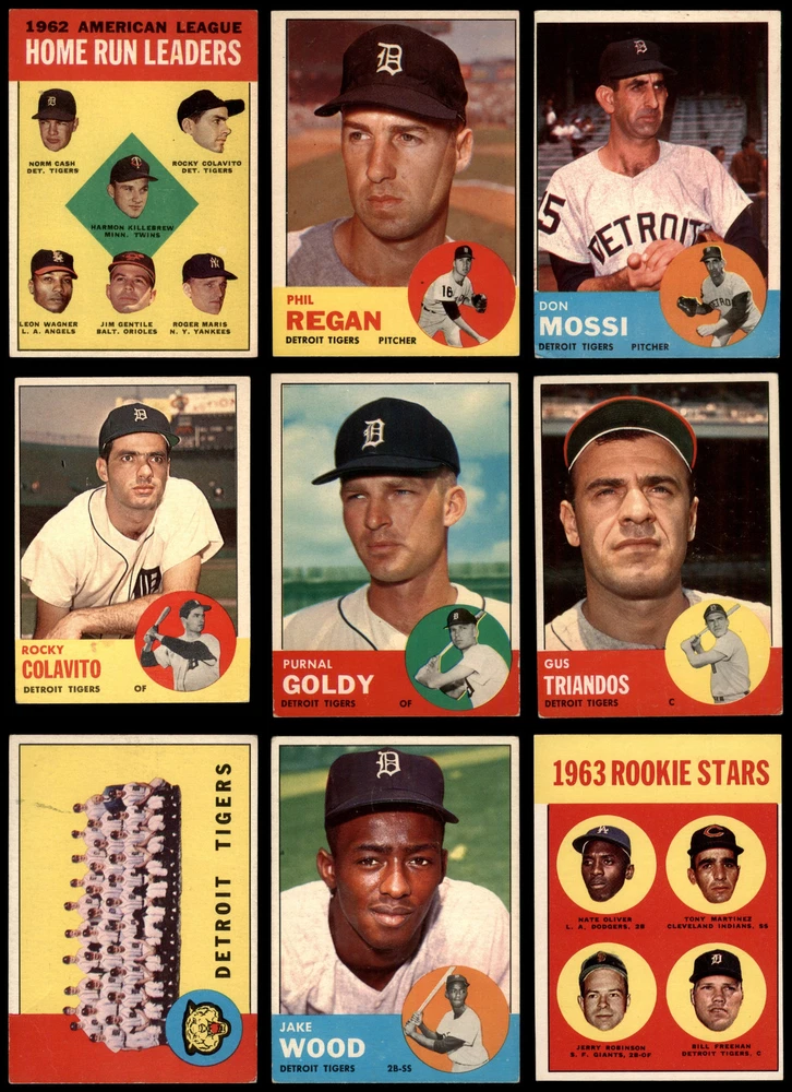 This set contains the following cards 1963 Topps #4 - Harmon Killebrew / Roger Maris / Norm Cash / Rocky Colavito / Jim Gentile / Leon Wagner AL HR Leaders 5 - EX Front Back 1963 Topps #6 - Whitey Ford / Dean Chance / Hank Aguirre / Eddie Fisher / Robin Roberts AL ERA Leaders 3 - VG Front Back 1963 Topps #8 - Jim Bunning / Camilo Pascual / Dick Donovan / Ray Herbert / Ralph Terry AL Pitching Leaders 4 - VG/EX Front Back 1963 Topps #10 - Jim Bunning / Camilo Pascual / Jim Kaat / Juan Pizarro / Ralph Terry AL Strikeout Leaders 4 - VG/EX Front Back 1963 Topps #25 Al Kaline 3 - VG Front Back 1963 Topps #44 Terry Fox 4 - VG/EX Front Back 1963 Topps #64 Dick McAuliffe 4 - VG/EX Front Back 1963 Topps #84 Ron Kline 4 - VG/EX Front Back 1963 Topps #134 Bob Scheffing 4 - VG/EX Front Back 1963 Topps #140 Frank Lary 3 - VG Front Back 1963 Topps #164 Bubba Morton 5 - EX Front Back 1963 Topps #177 Bubba Phillips 4 - VG/EX Front Back 1963 Topps #218 - Jim Bunning / Frank Lary / Don Mossi Tiger Twirlers 3 - VG Front Back 1963 Topps #224 May or may not have black mark just below insert photo Mike Roarke 4 - VG/EX Front Back 1963 Topps #240 Rocky Colavito 4 - VG/EX Front Back 1963 Topps #257 Hank Aguirre 4 - VG/EX Front Back 1963 Topps #278 Chico Fernandez 4 - VG/EX Front Back 1963 Topps #302 Whitey Herzog 3 - VG Front Back 1963 Topps #327 Paul Foytack 3 - VG Front Back 1963 Topps #348 Vic Wertz 4 - VG/EX Front Back 1963 Topps #365 Jim Bunning 4 - VG/EX Front Back 1963 Topps #379 Bob Anderson 4 - VG/EX Front Back 1963 Topps #406 Howie Koplitz 4 - VG/EX Front Back 1963 Topps #437 Billy Bruton 5 - EX Front Back 1963 Topps #445 Ball in Inset Photo can touch or not touch Border Norm Cash 3 - VG Front Back 1963 Topps #453 Jake Wood 4.5 - VG/EX+ Front Back 1963 Topps #466 - Bill Freehan / Tony Martinez / Nate Oliver / Jerry Robinson Rookie Stars 5 - EX Front Back 1963 Topps #475 Gus Triandos 3 - VG Front Back 1963 Topps #494 Phil Regan 4 - VG/EX Front Back 1963 Topps #516 Purnal Goldy 4 - VG/EX Front Back 1963 Topps #530 Don Mossi 3 - VG Front Back 1963 Topps #552 Tigers Team 1.5 - FAIR Front Back 1963 Topps #573 Coot Veal 3 - VG Front Back This is a 1963 Topps Detroit Tigers Team Set. Set breakdown by grade: Number of Cards in Set 33 Average Grade - Weighted by Value 4.06 - VG/EX Average Grade - Unweighted 3.76 - VG/EX Grade Breakdown 5 - EX 4 4.5 - VG/EX+ 1 4 - VG/EX 17 3 - VG 10 1.5 - FAIR 1 The following multi-team rookie cards are omitted, but can be purchased separately:#299 Rookie Stars - Dave Morehead / Tom Butters / Dan Schneider / Bob Dustal, #169 Rookie Stars - Gaylord Perry / Tommie Sisk / Dick Egan / Julio Navarro, #558 Rookie Stars - Ron Hunt / Bill Faul / Al Moran / Bob Lipski and #407 Rookie Stars - Chico Ruiz / Frank Kostro / Larry Elliot / Dick Simpson Dean's Cards offers a 100% Money Back Satisfaction Guarantee on all purchases. Just contact us within 10 days of the purchase date and we will refund your money or, when possible, replace the cards. 1963 Topps Detroit Tigers Team Set 4 - VG/EX 6913975 If the scan in the listing says ACTUAL IMAGE, you will receive the card pictured. For cards issued after 1983, we will often use representative images and you will not receive the exact card pictured. Shipping Policy You only pay shipping on the first item. If you order multiple items on the same order, you will only be charged once for shipping. We do not combine shipping on multiple orders. To avoid multiple shipping charges we recommend using eBay's "Add to Cart" feature to check out multiple items in one transaction, or please request and allow for us to send an invoice to reflect the combined shipping charges. Canadian customers - We send all of our Canadian/International packages with tracking and cannot make any exceptions to this policy. Negotiating Prices All prices are final and we do not negotiate. This policy is to ensure that everyone knows that they are getting our best possible price. So please do not ask us to negotiate on price. Return Policy Dean's Cards has a 100% Money Back Satisfaction Guarantee on all purchases, as long as the product is returned within 30 days of receiving the product. Card Grading Each card is first reviewed by a member of our team, in order to detect any flaws that may not be visible on a scan, such as wrinkles, creases, print spots, or light stains. The vast majority of our vintage cards are professionally graded by the Dean's Cards Grading Software and include a 100% satisfaction guarantee. Our grading is on par with PSA standards when it comes to corners, centering and flaws - and tends to grade a bit tougher than PSA, on cards with a tilted image or rough edges. This grading software was developed to provide far better grading and consistency than can be achieved using the human eye. Determining the card's grade The sharpness of the corners and the degree to which a card was cut off-center determines the maximum possible grade that the card can receive. The card's grade is further reduced by any flaws or blemishes that it may have. Each card is evaluated on the following characteristics and assigned a score. Corners - Each corner of a card is individually analyzed, and then assigned a score on how square, sharp, and flawless it appears. Centering - The borders are measured, at multiple points along the edge, to determine the horizontal and vertical centering and tilt. Defects - The card is examined for imperfections, such as: size, print flaws, dings, stains, creases, or other wear which could lower its grade. Bonus for Perfect Centering - A vintage card, with near perfect centering, is given a one-half grade bonus. So when you buy one of our cards with a half-grade (e.g. 3.5 or 6.5) it will appear perfectly centered, both vertically and horizontally. Grading Criteria Worst Corner - A card can grade only as high as the worst corner will allow. Average Corner Tilt - The difference in width of a card border near the top, compared to the bottom. OCT - The 