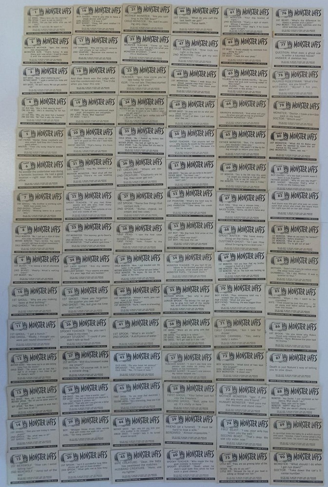 Step back into the chilling world of 1960s monster madness with this rare complete 1963 Topps Monster Laffs Midgee full set —both Series 1 and the tough Series 2 high numbers! Featuring all 153 cards (#1-#153), these pocket-sized vintage non-sport trading cards (measuring just 40mm x 64mm) deliver classic black-and-white photos of iconic horror creatures and B-movie scenes, paired with hilarious gag captions on the fronts and groan-worthy "Monster Laffs" jokes on the backs. Originally issued in perforated 3-card panels (here carefully separated into singles), this expanded set captures the peak of goofy, spooky 1960s monster fun with many images reused and expanded from Topps' standard-size series. The low numbers (#1-108) are more common, but the scarce high numbers (#109-153, just 45 cards) make full completion a true challenge—highly sought-after and rarely found together in strong grade. Overall Excellent or better condition, with a few slightly lesser—retaining that genuine vintage appeal without heavy wear. Please examine the photos carefully—you'll receive the exact set pictured. This full 153-card masterpiece is one of the toughest 1960s monster sets to assemble complete in high grade! A prized treasure for any horror trading card collector! Manufacturer: Topps, 1963 Condition: Overall Excellent or better condition, with a few lesser. Examine photos carefully – this is the exact set you will receive. View pictures closely Check out our other Monster Movie Magazines and Cards listed! Shop TvMovieCards – sci-fi, horror, TV – all in stock!